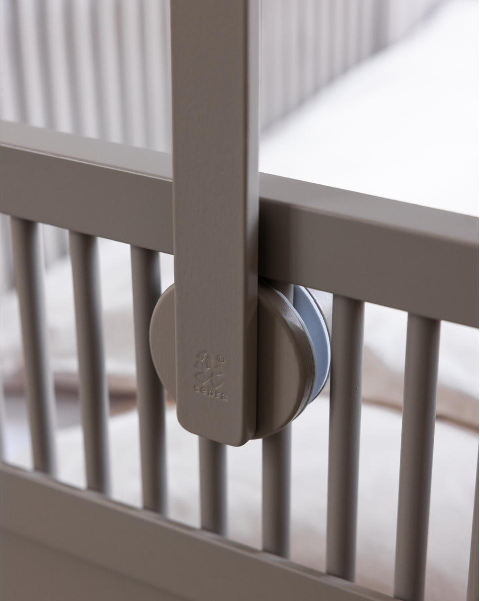 De houder is zeer eenvoudig in gebruik: hij wordt met een paar handelingen stevig vastgeklemd tussen de spijlen van het Sebra Junior & Grow bed of vrijwel elk ander ledikant. Een bijzonder detail zijn de gevoerde schijven op de bevestigingspunten. Deze zorgen voor een stabiele grip en beschermen tegelijkertijd het hout van het bed tegen krassen en afdrukken.