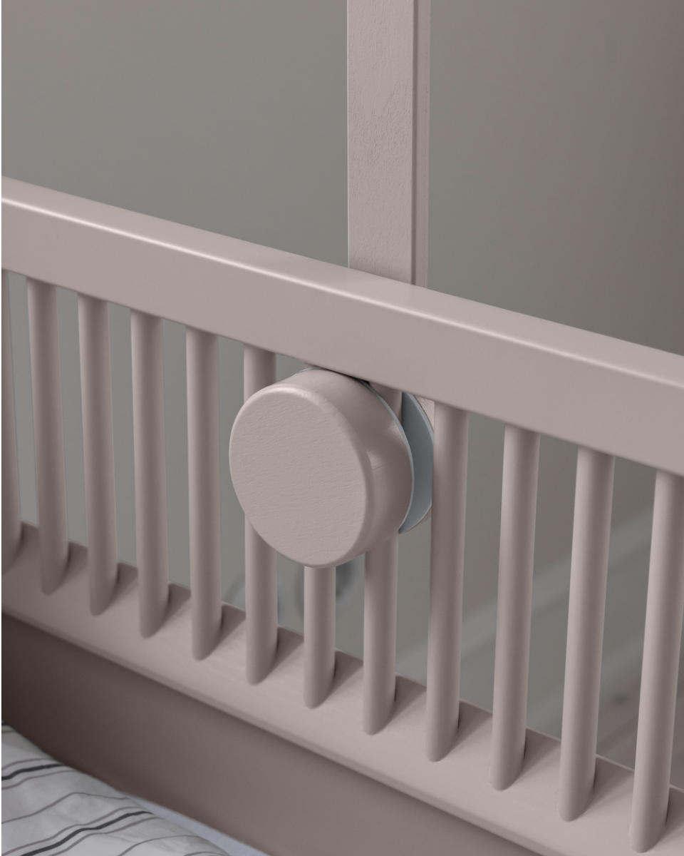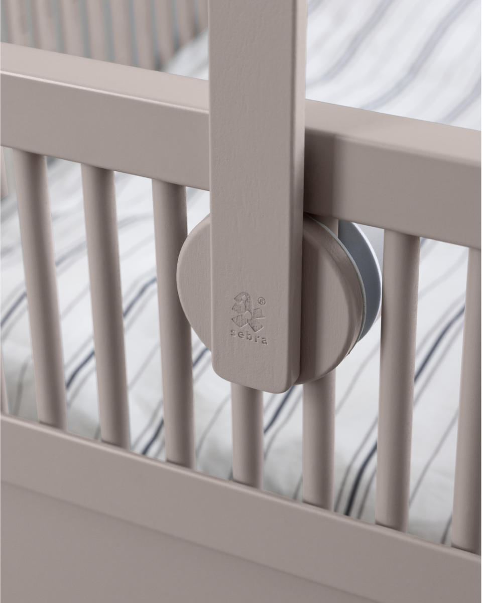De houder is zeer eenvoudig in gebruik: hij wordt met een paar handelingen stevig vastgeklemd tussen de spijlen van het Sebra Junior & Grow bed of vrijwel elk ander ledikant. Een bijzonder detail zijn de gevoerde schijven op de bevestigingspunten. Deze zorgen voor een stabiele grip en beschermen tegelijkertijd het hout van het bed tegen krassen en afdrukken.