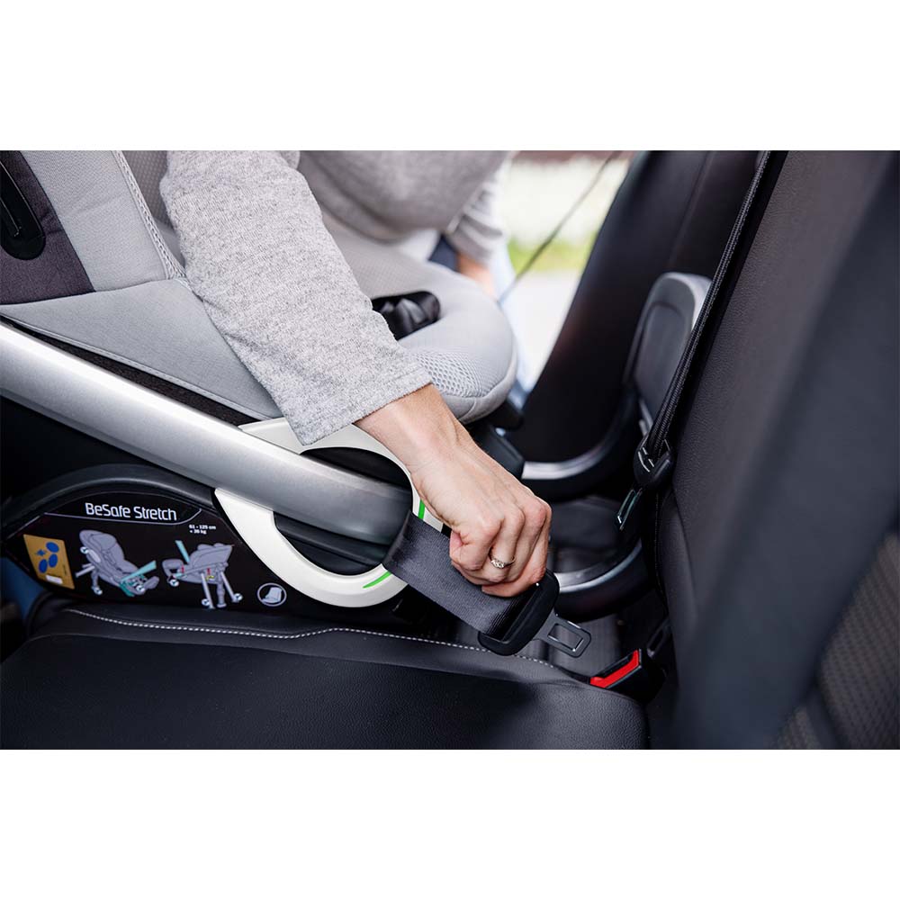 Om ervoor te zorgen dat zoveel mogelijk gezinnen gebruik kunnen maken van de Besafe Stretch, wordt de reboarder bevestigd met behulp van de veiligheidsgordels van de auto. Het zitje is niettemin stevig verankerd in de autostoel met zijn steunpoot en de bevestiging van het Eco-Frame, en absorbeert de krachten die erop werken bij een frontale botsing op de best mogelijke manier. De stijve achterkant van de zitschaal brengt de energie van het kind over op het Exo-Frame en houdt het kind op zijn plaats tijdens de botsing.