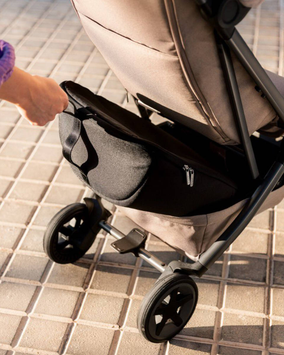 Wanneer de korftas wordt opgehangen door de flap eenvoudig in het vak achter de zitting te steken, ontstaat er nog meer ruimte. Zo functioneert de tas niet alleen als opbergtas, maar ook als beschermende afdekking. Boodschappen, speelgoed of verzorgingsspullen blijven beschermd tegen vuil en opspattend water – ideaal voor wisselvallige dagen in de stad.