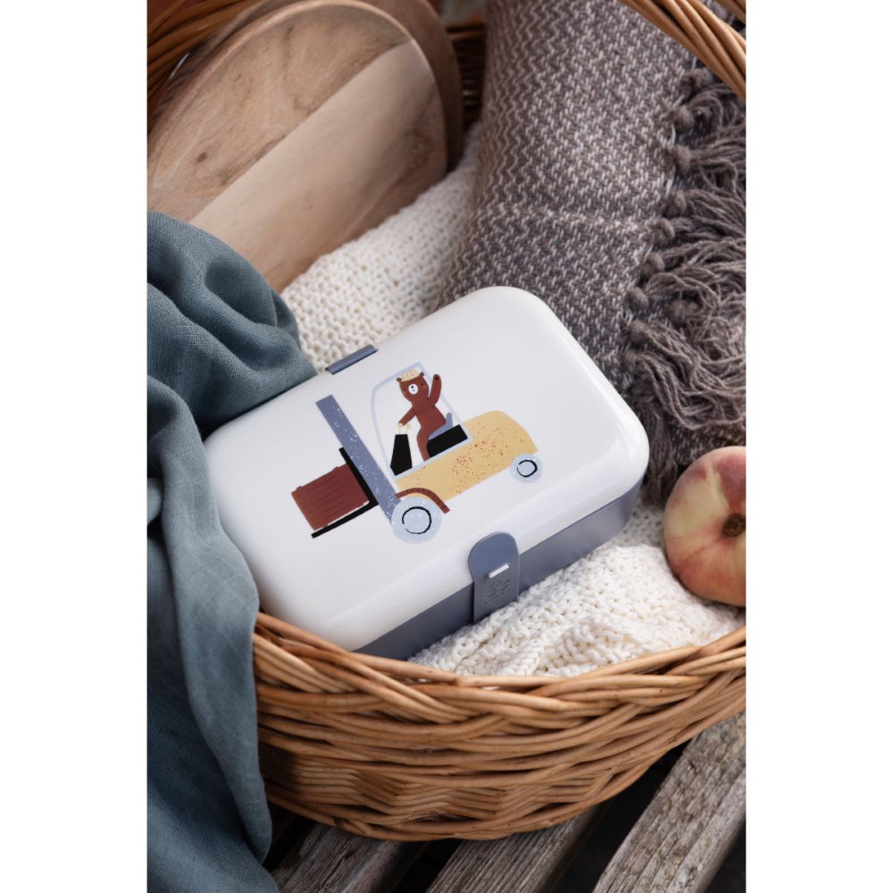 Het deksel van de lunchbox kan gemakkelijk worden geopend en gesloten met de stevige siliconen band – ideaal voor kleine handjes. De creatieve illustraties op het deksel wekken nieuwsgierigheid op en nodigen je kindje uit om de wereld van de lunchbox te ontdekken.