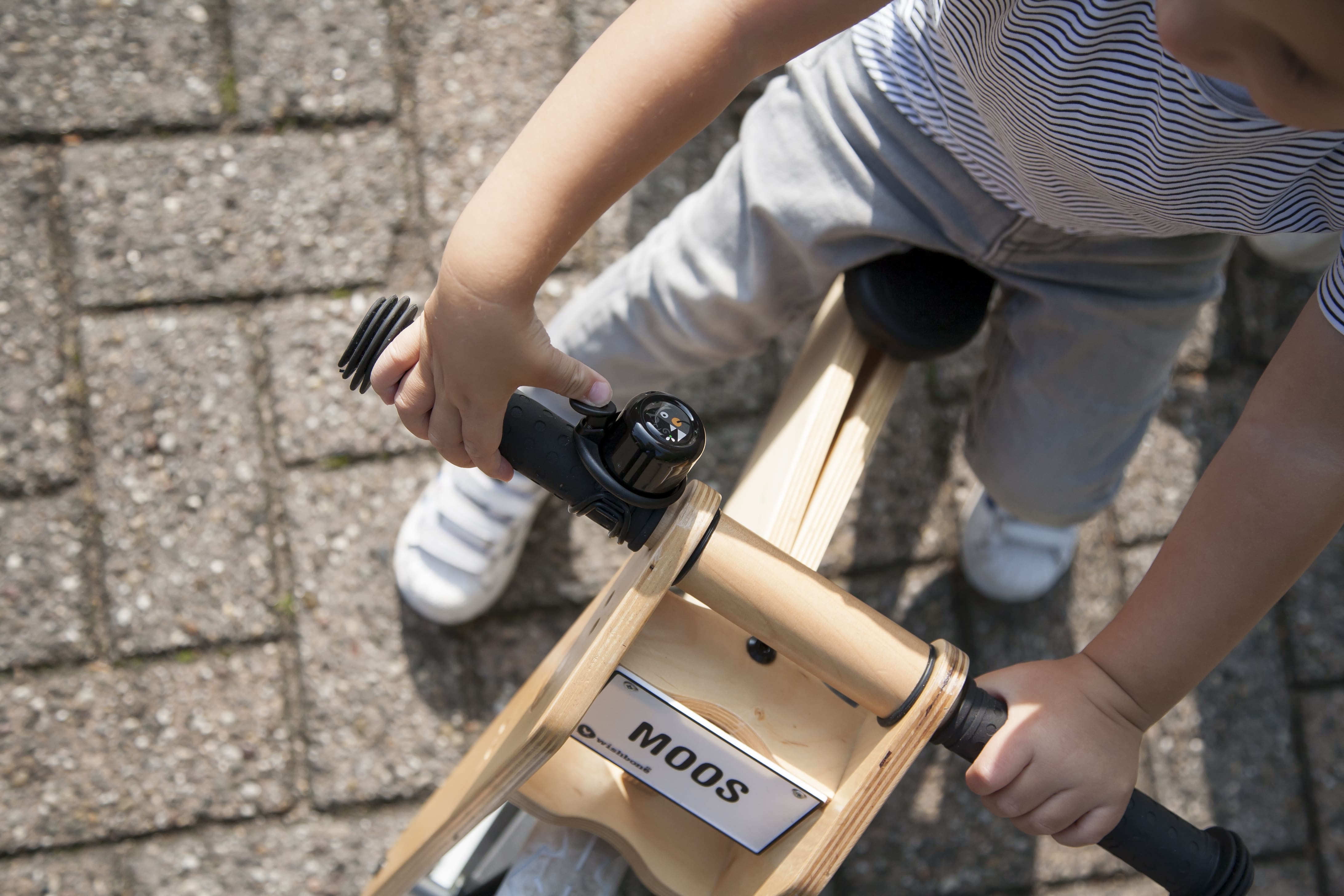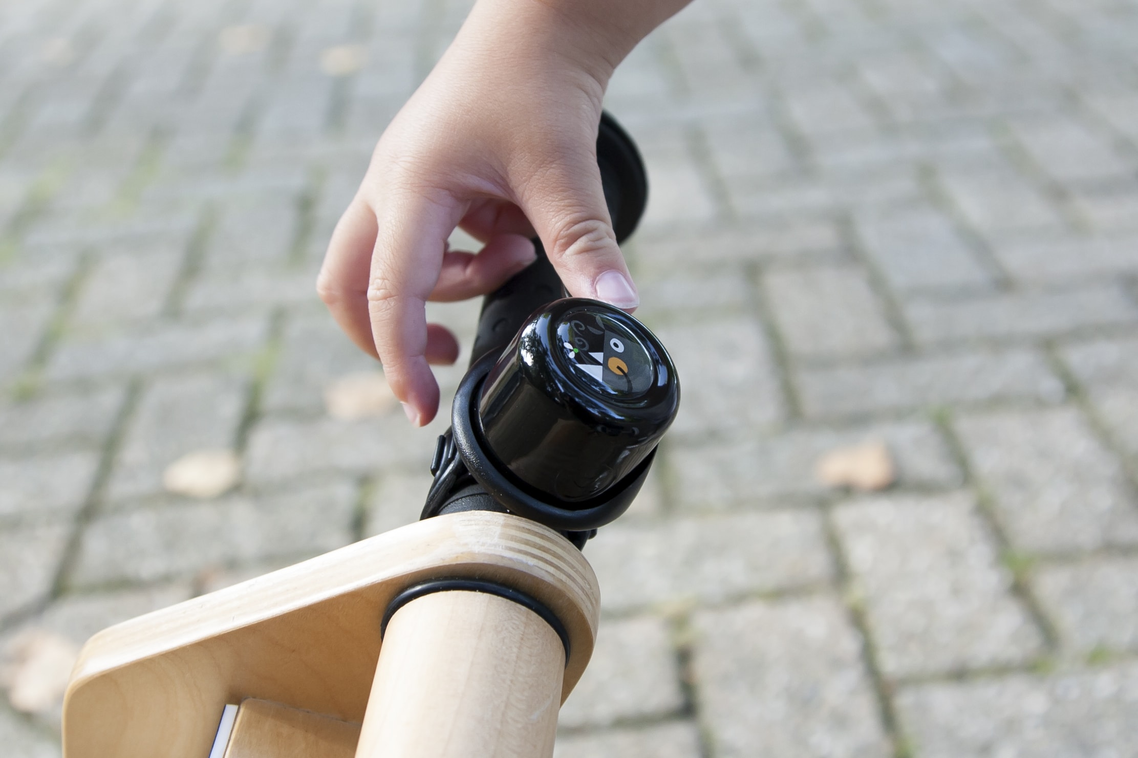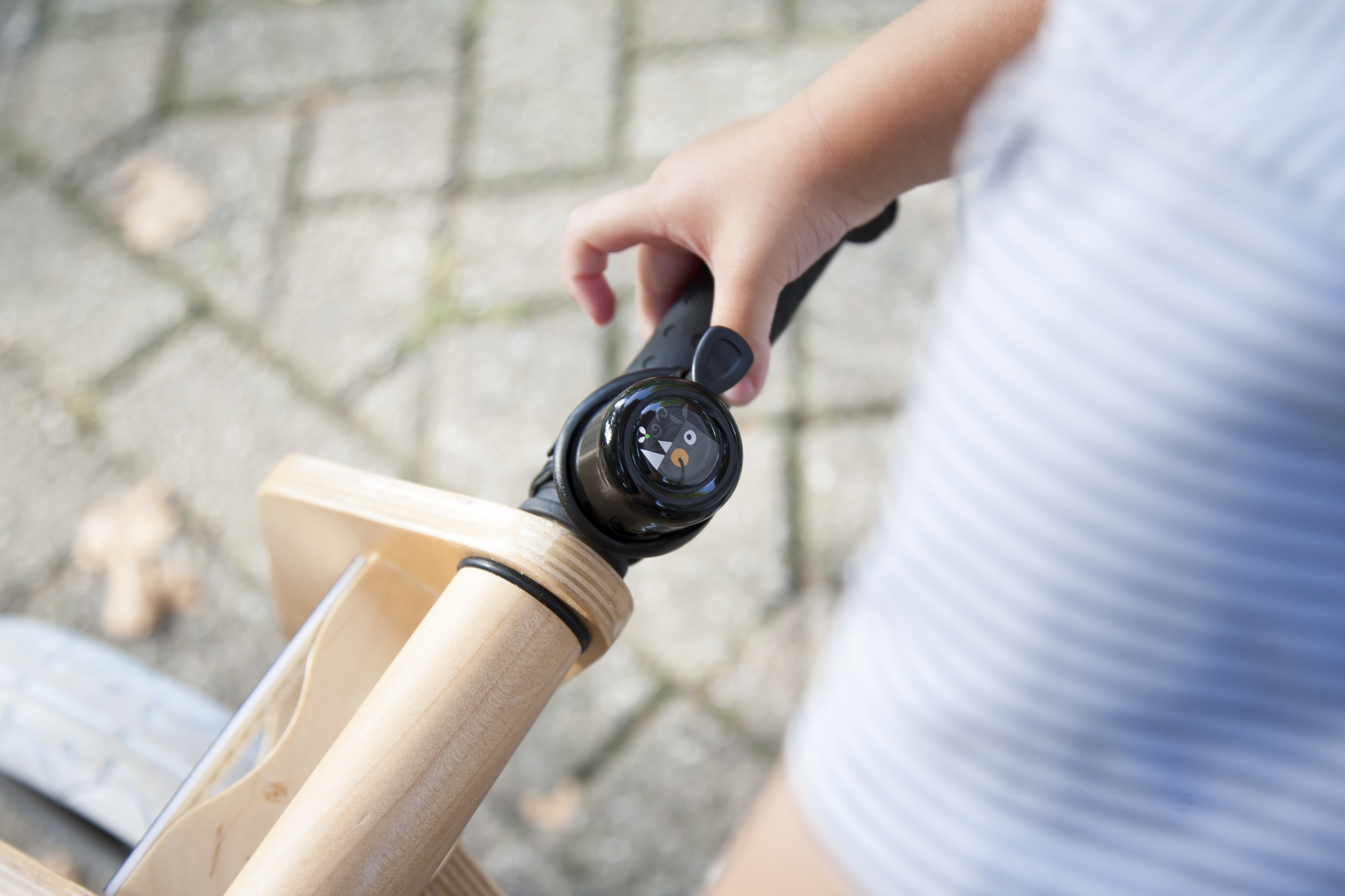 Diese Fahrradklingel ist wirklich schön und praktisch zugleich. Mit den zwei unterschiedlich großen Gummibändern ist sie flexibel und super schnell anzubringen. Sie passt gut an den breiten Lenker unseres Holzlaufrades.