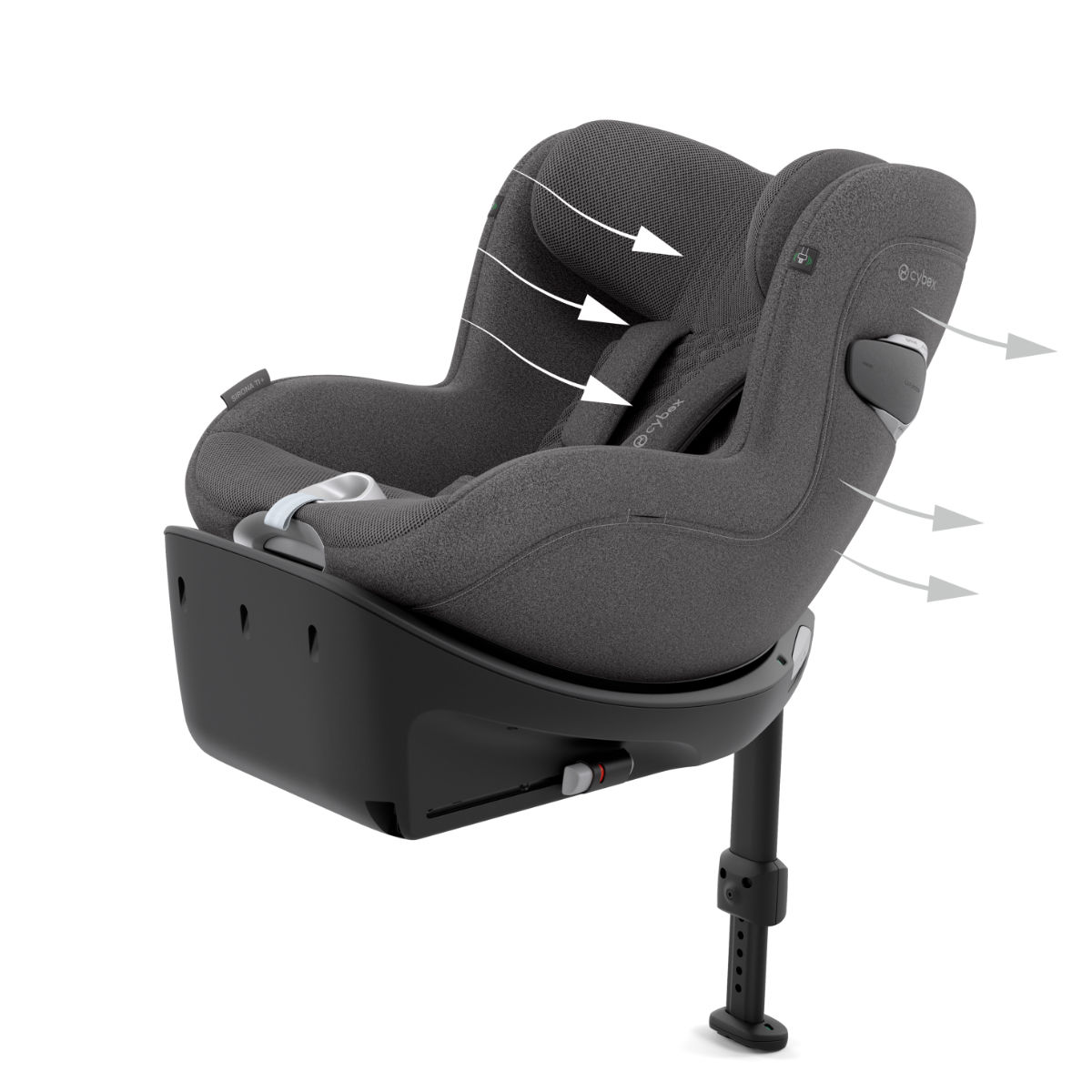 Interne tests bevestigen: In de achterwaarts gerichte positie biedt de Sirona Ti tot 50% meer veiligheid bij een frontale botsing in vergelijking met conventionele voorwaarts gerichte stoelen. De krachten worden over de grote achterzijde van de stoel verdeeld, wat de belasting op de gevoelige nek en rug van je kind enorm vermindert. CYBEX adviseert daarom om tot de leeftijd van 4 jaar achterwaarts te reizen.