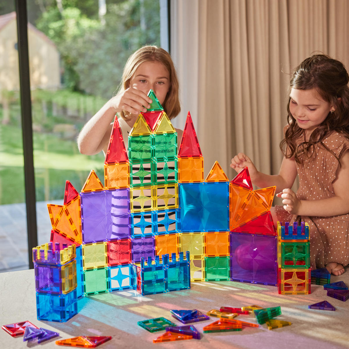 De felle, doorschijnende platen zijn prachtig om naar te kijken, vooral wanneer het zonlicht erdoorheen valt. Bouw bijvoorbeeld vlak voor het raam voor het mooiste lichteffect. Ook op andere verticale oppervlakken, zoals de koelkast, kun je experimenteren met kleur en licht. Zo worden jouw bouwwerken een visueel en zintuiglijk avontuur.