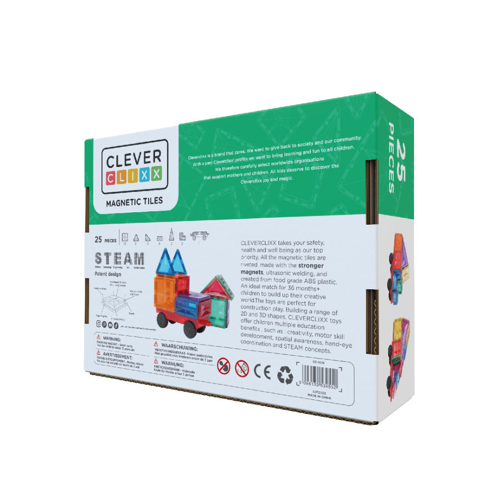 De Cleverclixx Auto-Bouwset in Felle Kleuren – 25 Delige Magnetische Bouwstenen kan eenvoudig gecombineerd worden met andere Cleverclixx-sets. Daarnaast is de set volledig compatibel met merken zoals Connetix en Magna-Tiles, zodat de speelwereld blijft groeien.