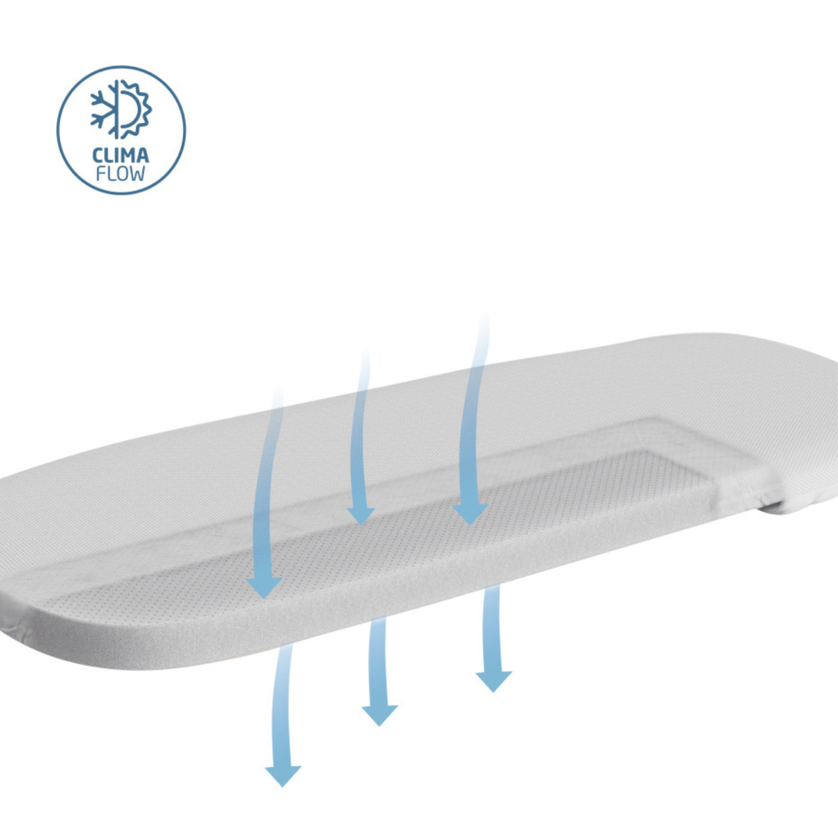 Je baby ligt op een omkeerbaar traagschuimmatras: één zijde met zachte 100% biokatoen, de andere met ademend mesh voor een fris klimaat. Geïntegreerde ClimaFlow-ventilatie-elementen bevorderen de luchtcirculatie – zo voelt je baby zich het hele jaar door prettig.