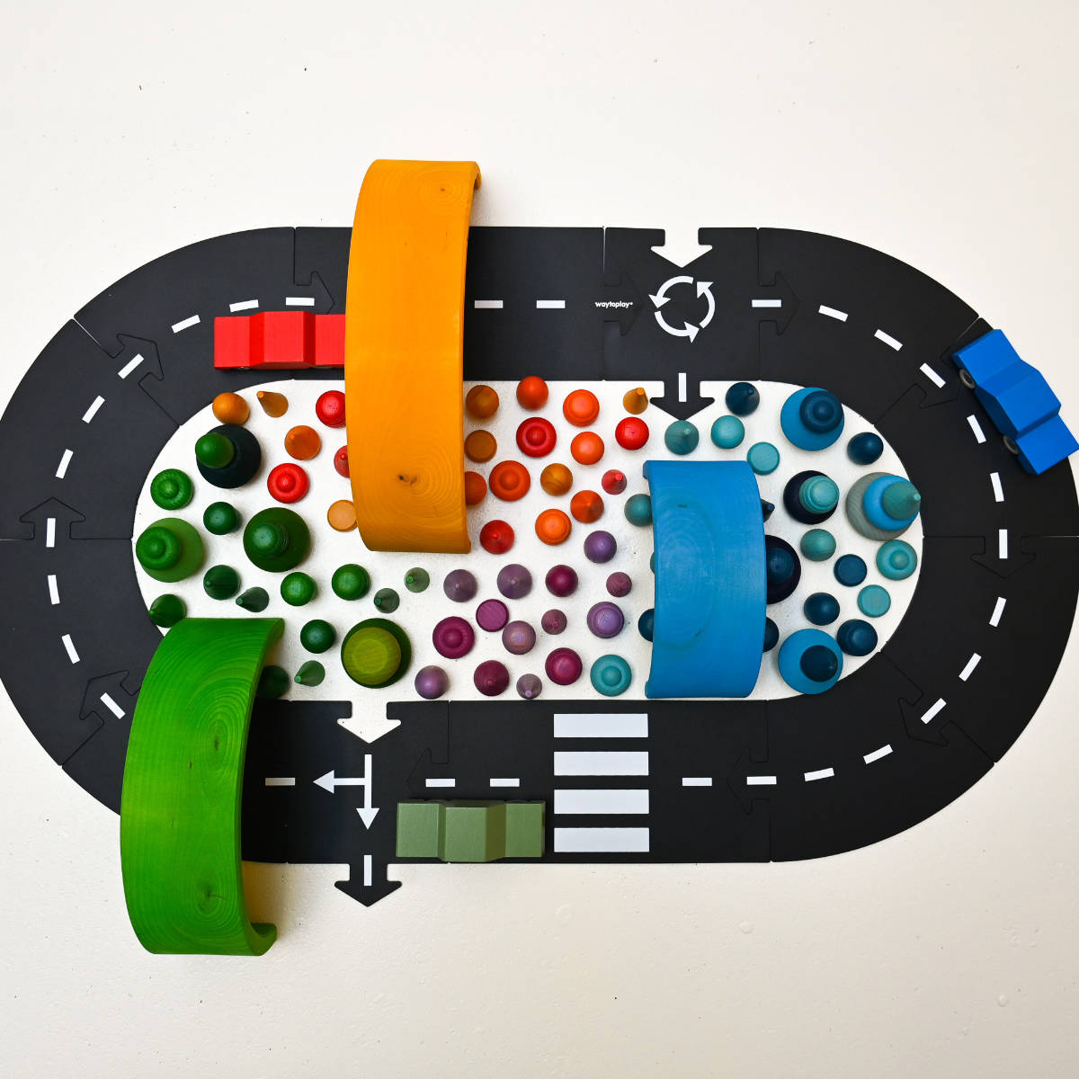 Waytoplay werkt fantastisch samen met auto’s, houten speelgoed en bouwsets. Zo groeit het spel mee met de fantasie van je kind.