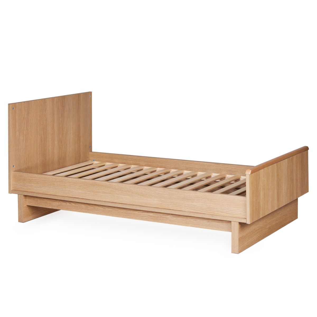 Het Kyo bed is verkrijgbaar in twee maten: 120 × 70 cm of 140 × 70 cm. Beide modellen hebben drie verstelbare hoogtes voor de lattenbodem – ideaal voor elke groeifase. De grotere versie (140 × 70 cm) biedt extra ruimte en kan zonder extra onderdelen worden omgebouwd tot een open peuterbed.