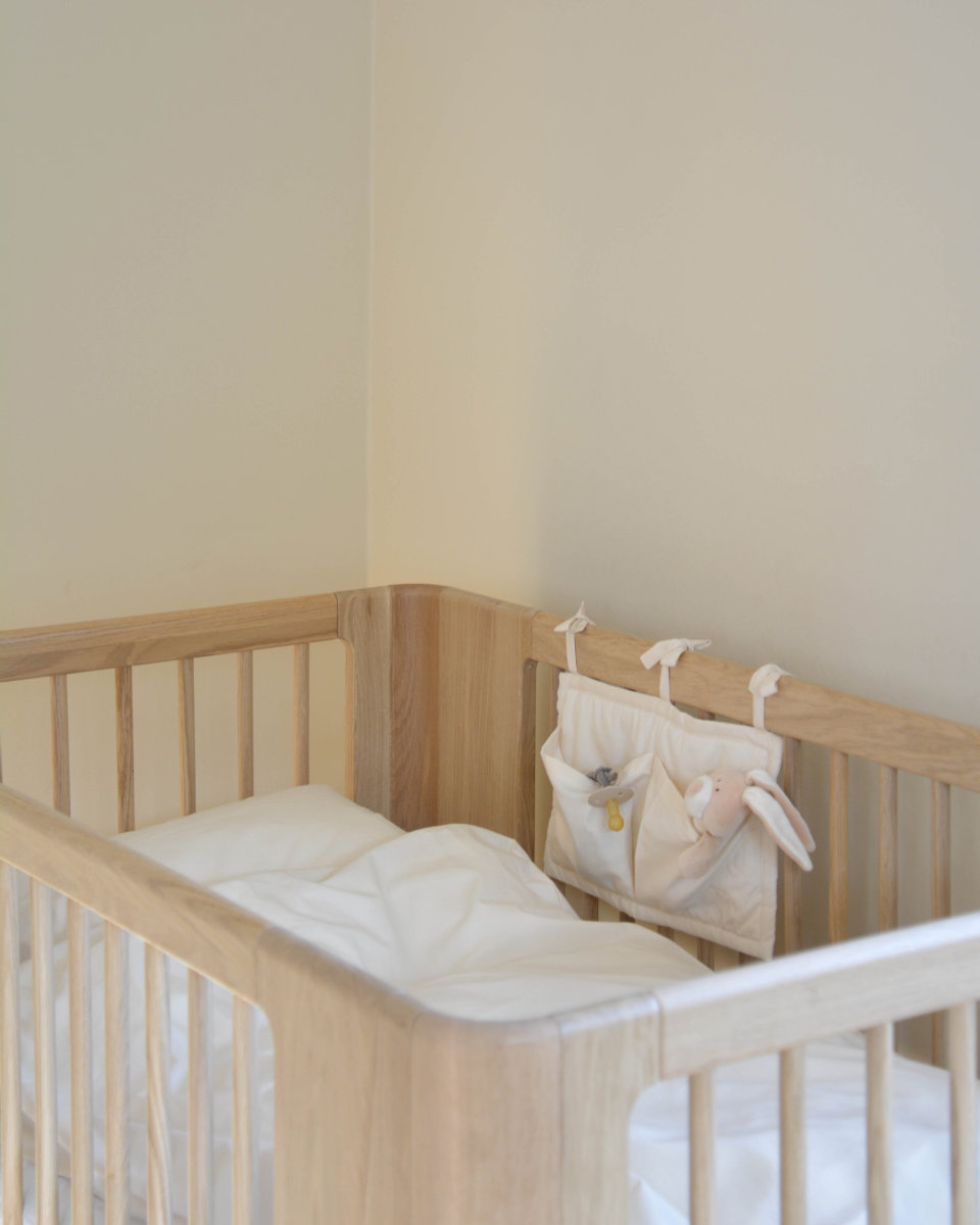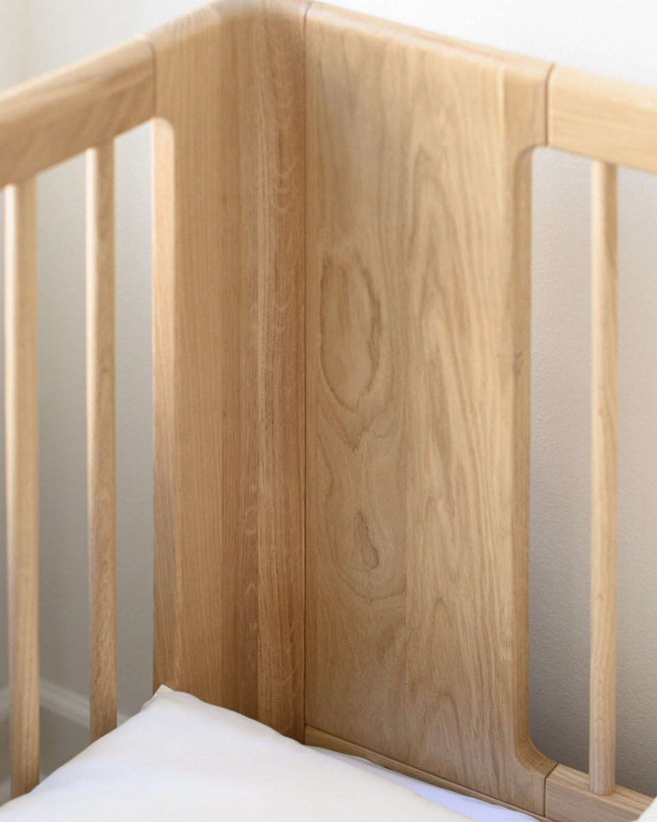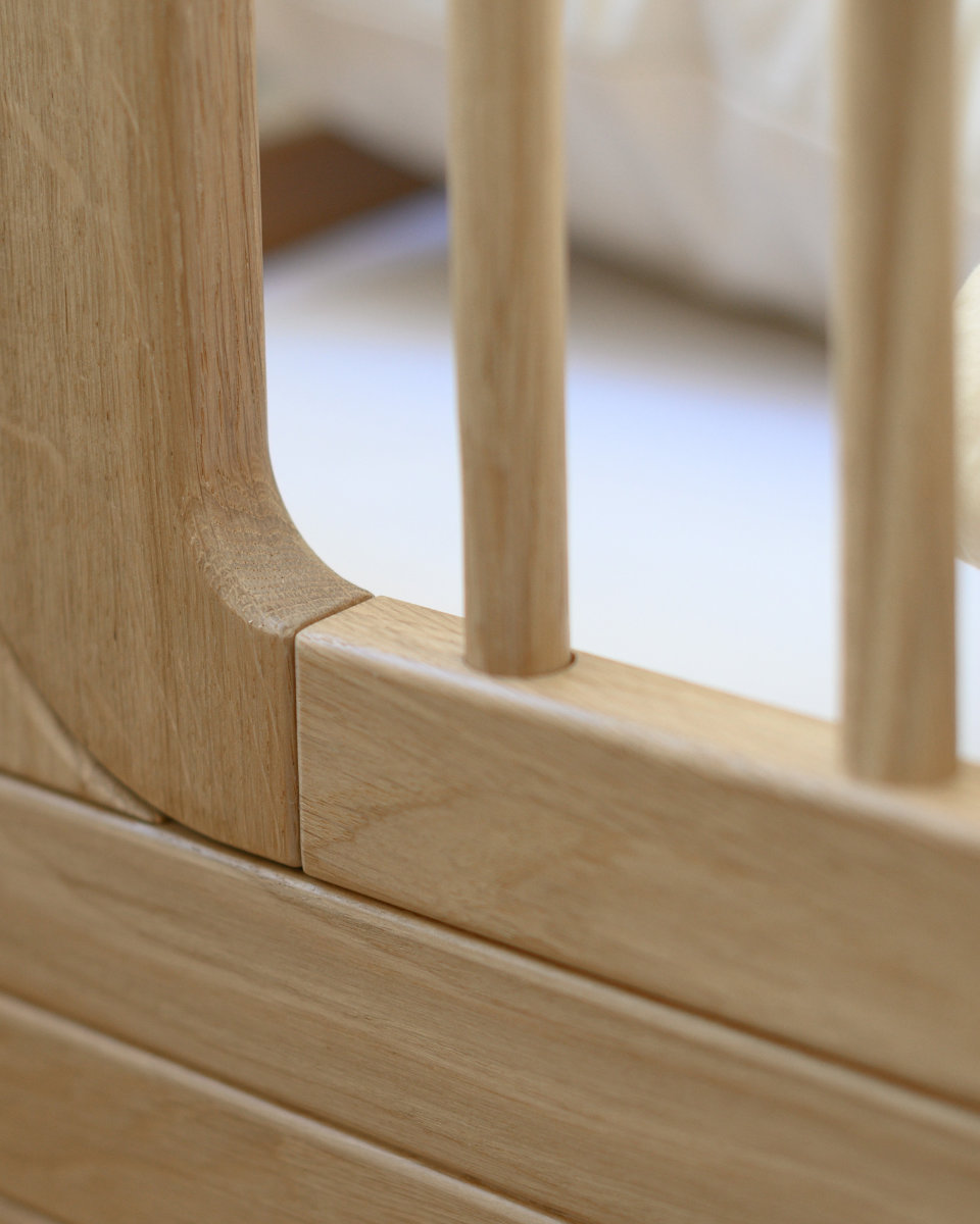 De zachte, afgeronde hoeken en het minimalistische ontwerp maken dit babybed veilig en stijlvol. De matte afwerking benadrukt de natuurlijke nerf van het hout.