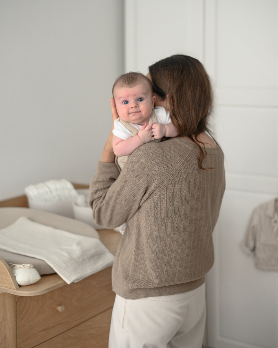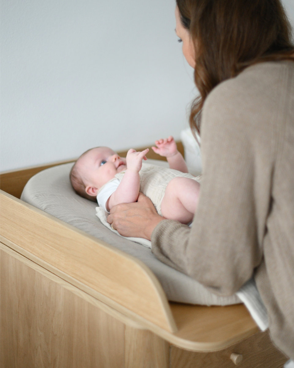 Het afneembare aankleedelement past perfect op de commode. Het is ruim genoeg voor een standaard verschoonmat en laat zich stevig bevestigen – zonder zichtbare schroeven. Zodra het niet meer nodig is, verwijder je het zonder beschadiging.