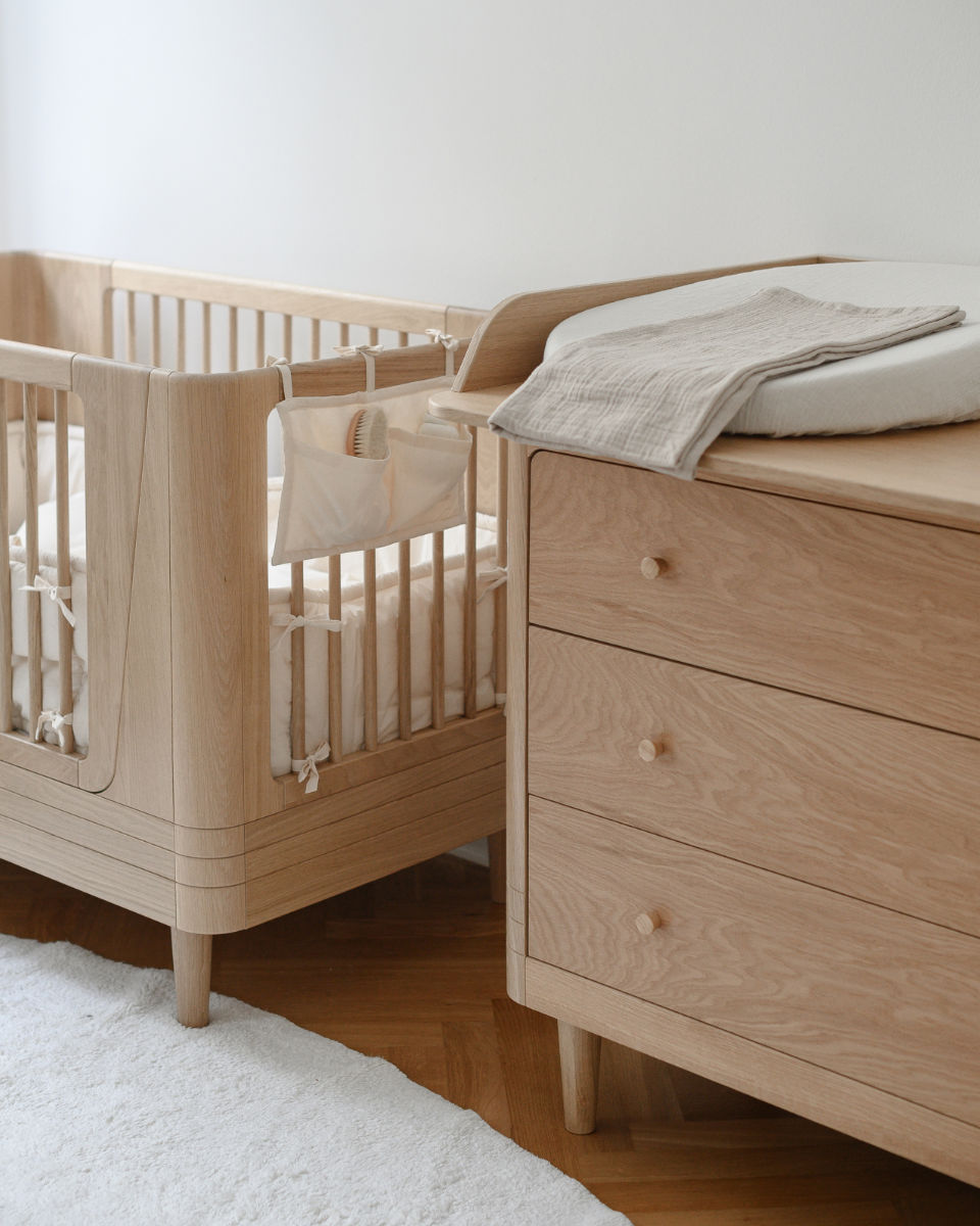 De meubels zijn ontworpen om jarenlang mee te gaan. Het babybed kan worden omgebouwd tot juniorbed, de commode blijft een praktische opbergoplossing en het aankleedelement is eenvoudig te verwijderen wanneer je het niet meer nodig hebt.