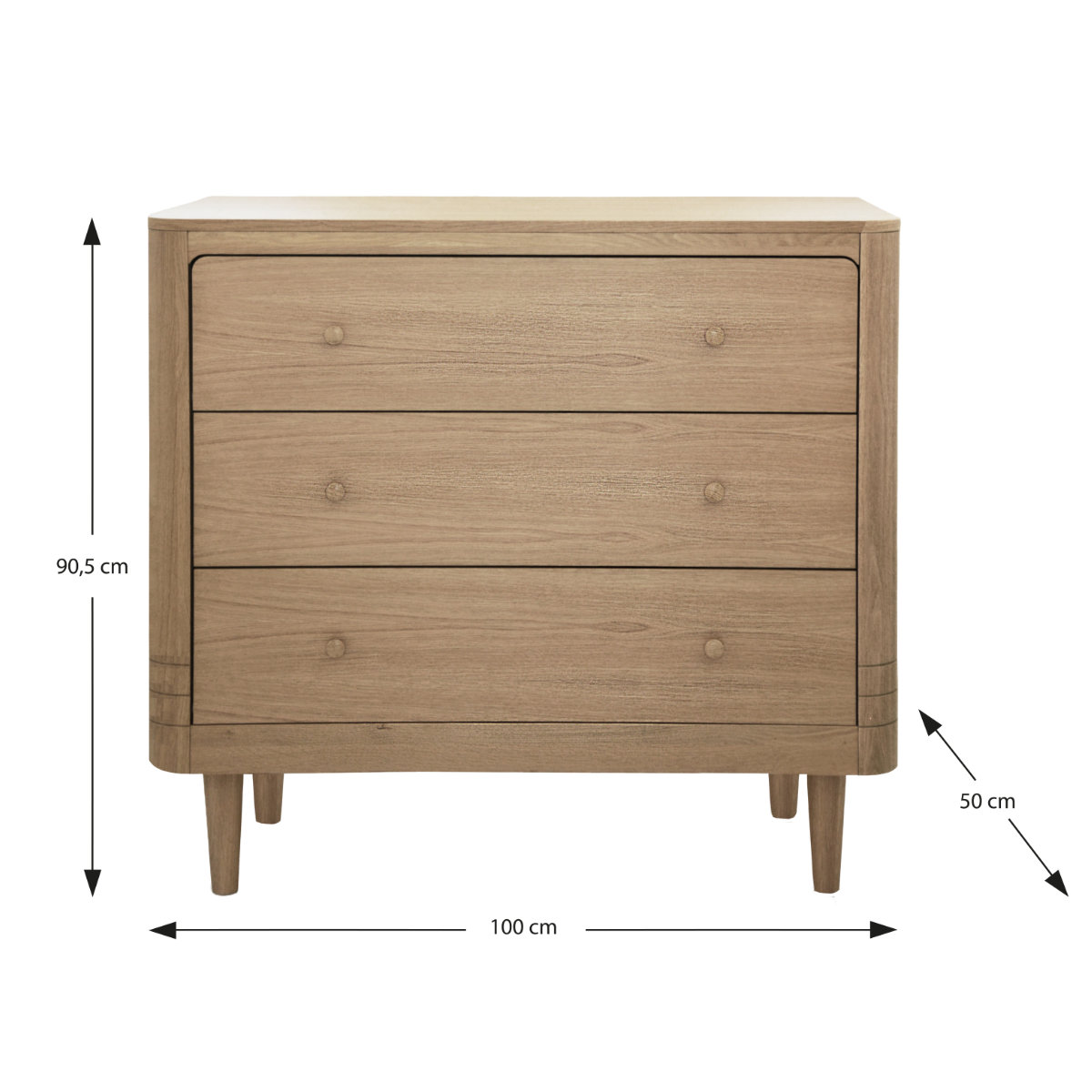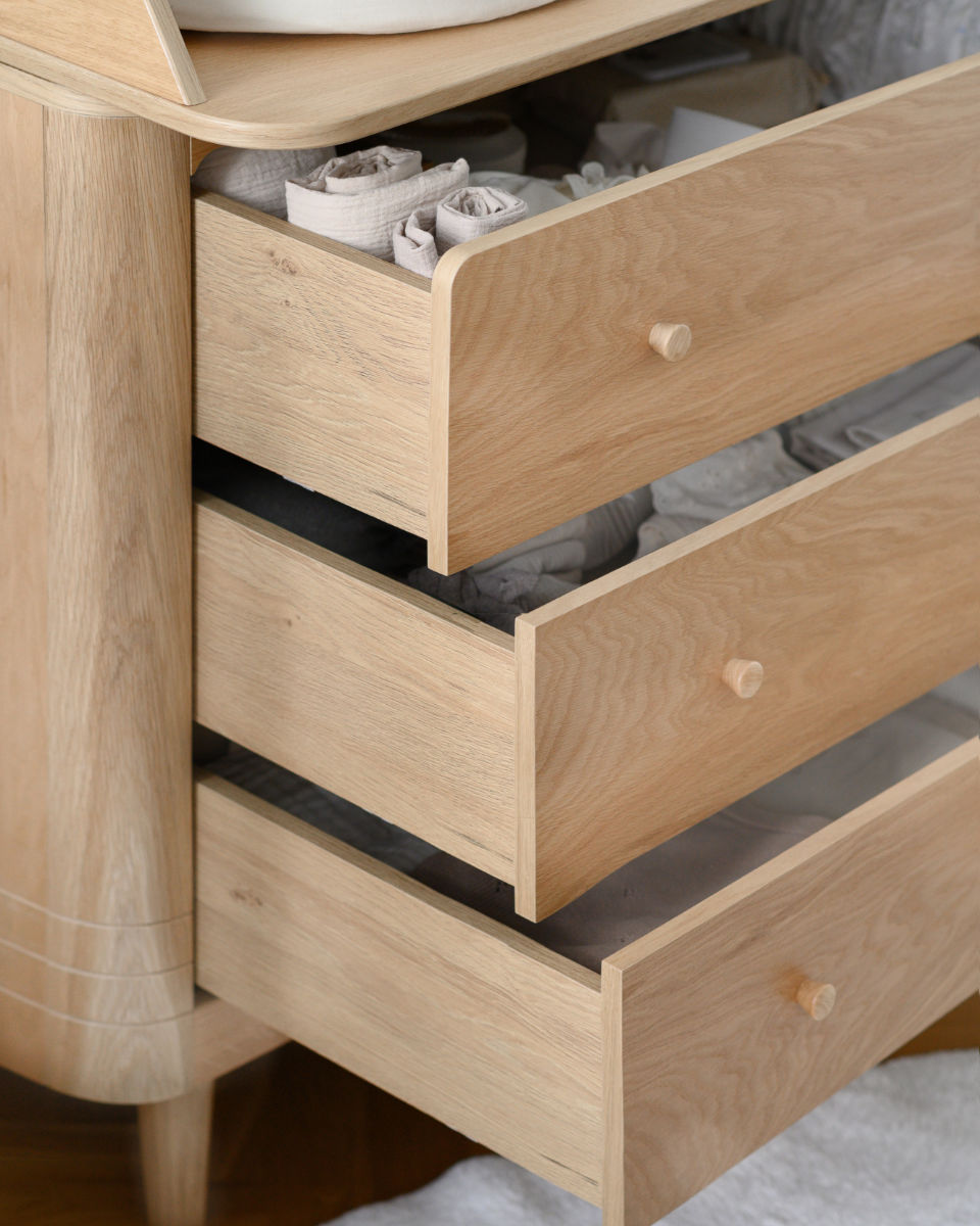 De commode is voorzien van drie ruime lades met soft-close systeem, zodat alles geruisloos sluit. Ideaal om babykleertjes, verzorgingsproducten en luiers overzichtelijk in op te bergen. Dankzij de solide constructie en minimalistische uitstraling past de commode in elke baby- of kinderkamer.