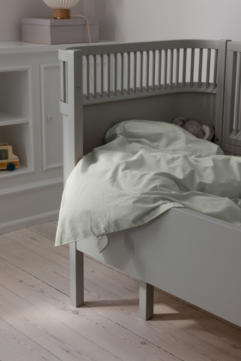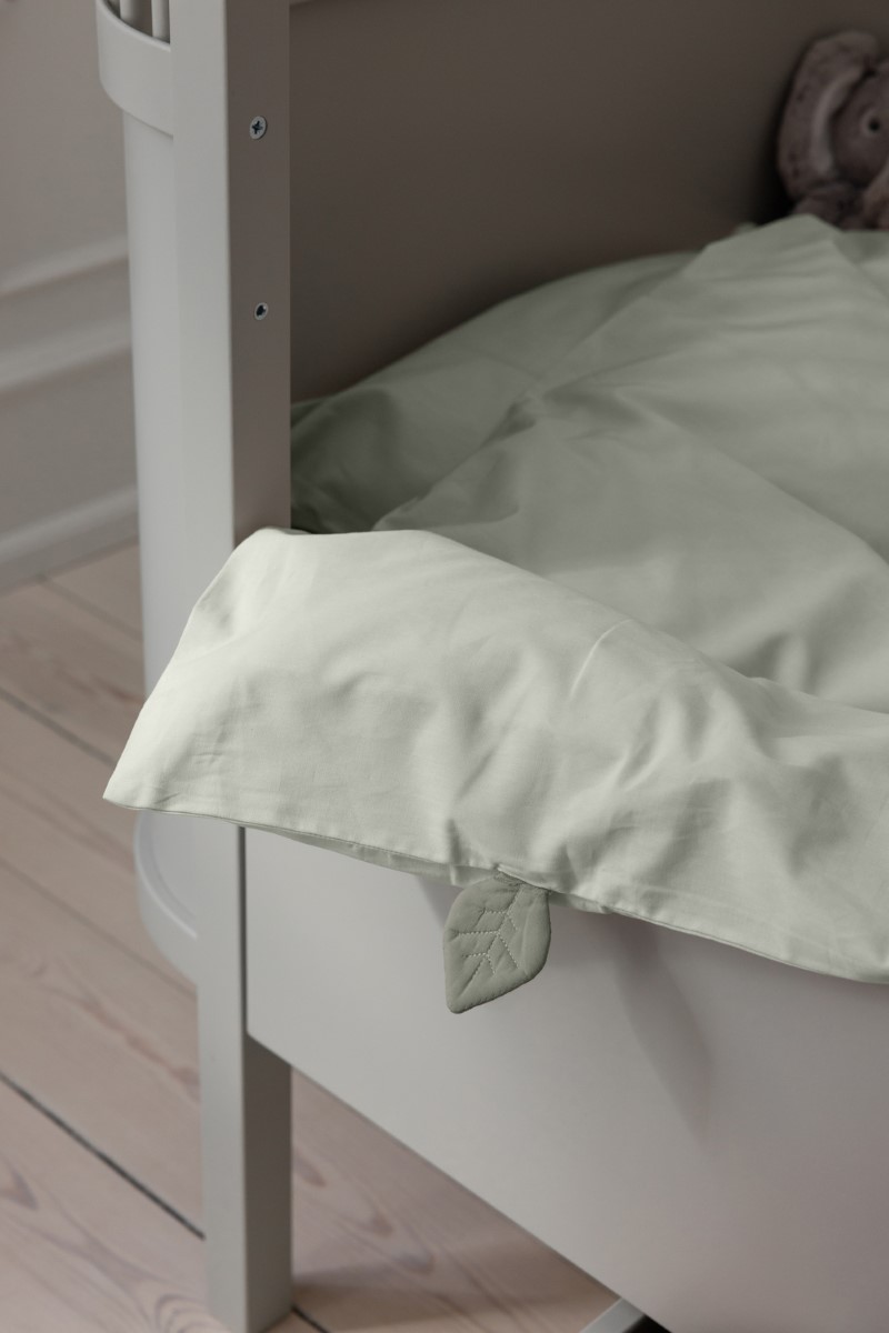De set bestaat uit een dekbedovertrek en een kussensloop. Beide zijn voorzien van een onopvallende YKK-rits die de nachtrust niet verstoort. Een bijzonder detail is het kleine “blaadje” aan het dekbedovertrek, dat kan dienen als troost voor slaperige vingers. Dankzij de precies passende afmetingen sluit het beddengoed perfect aan op het Sebra Baby & Junior Bed.
