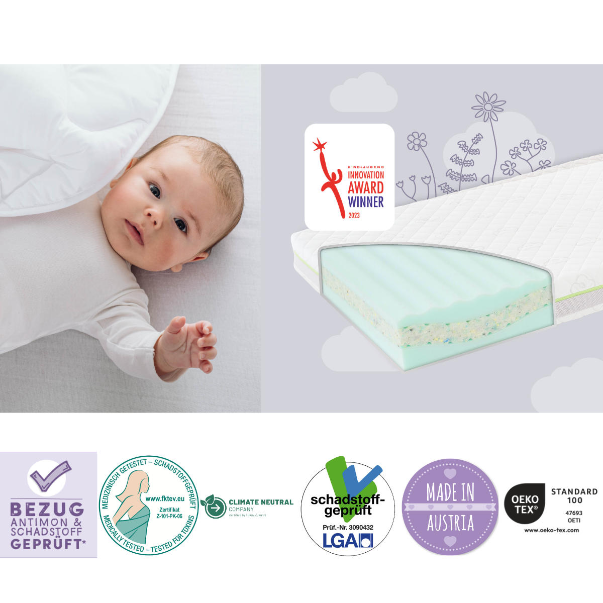 Träumeland matrassen worden uitsluitend in Oostenrijk geproduceerd met zorgvuldig geselecteerde materialen. Met deze hoogwaardige premium matrassen van Träumeland kunt u er zeker van zijn dat jouw kleine lieveling goed slaapt en zich rondom goed voelt.