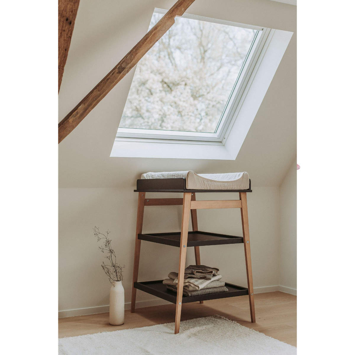 Met de praktische luiertafel van Quax heeft u babykleertjes en verzorgingsproducten altijd binnen handbereik. De luiertafel heeft 2 schappen waar je verschillende dingen op kunt leggen die je nodig hebt om de baby aan te kleden/schoon te maken. De luiertafel neemt niet veel ruimte in beslag, dus is hij ideaal voor een kleine slaapkamer of badkamer.