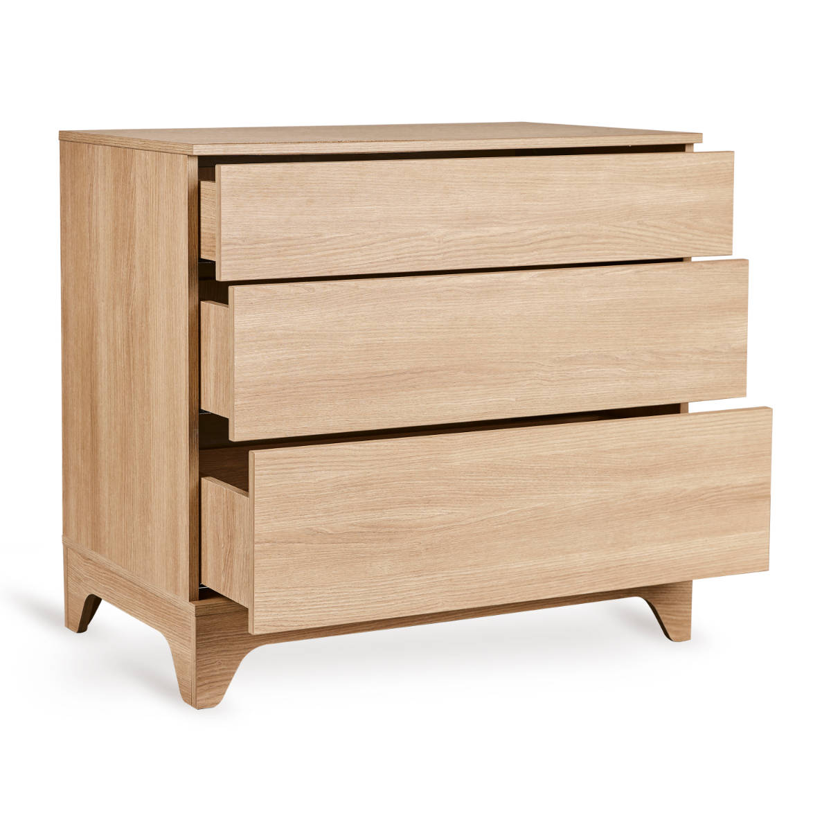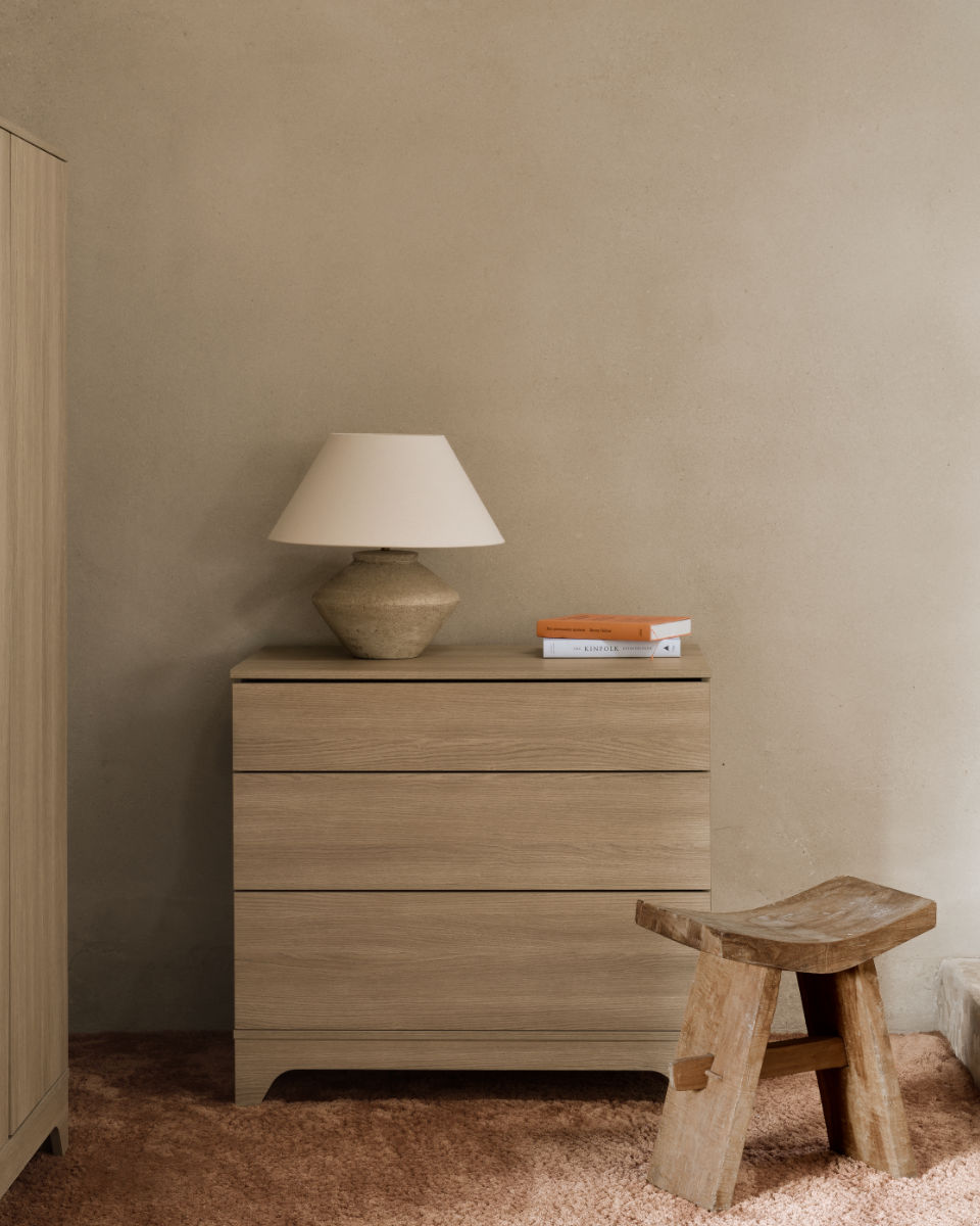 Met zijn drie greeploze push-to-open lades biedt de commode royale opbergruimte voor kleding, verzorgingsspullen en kleine dagelijkse items. Dankzij het soepele openingssysteem zijn de lades moeiteloos te bedienen – ideaal wanneer je maar één hand vrij hebt.