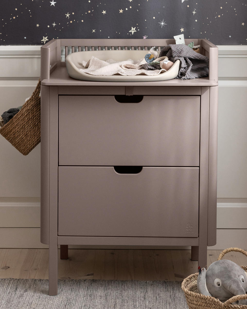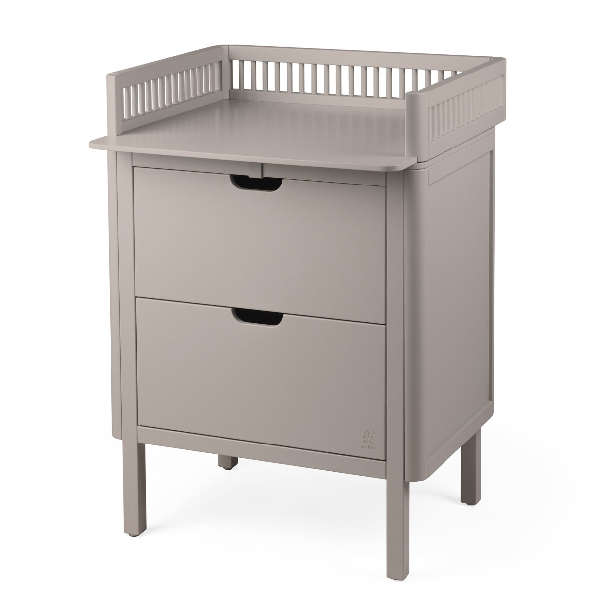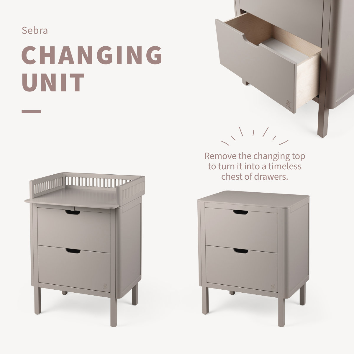 De Sebra commode is een elegant, functioneel en Deens vormgegeven 2-in-1 meubelstuk dat wordt geleverd met een commode, een verschoonblad en respectievelijk twee lades of planken met deuren, in wit of grijs.