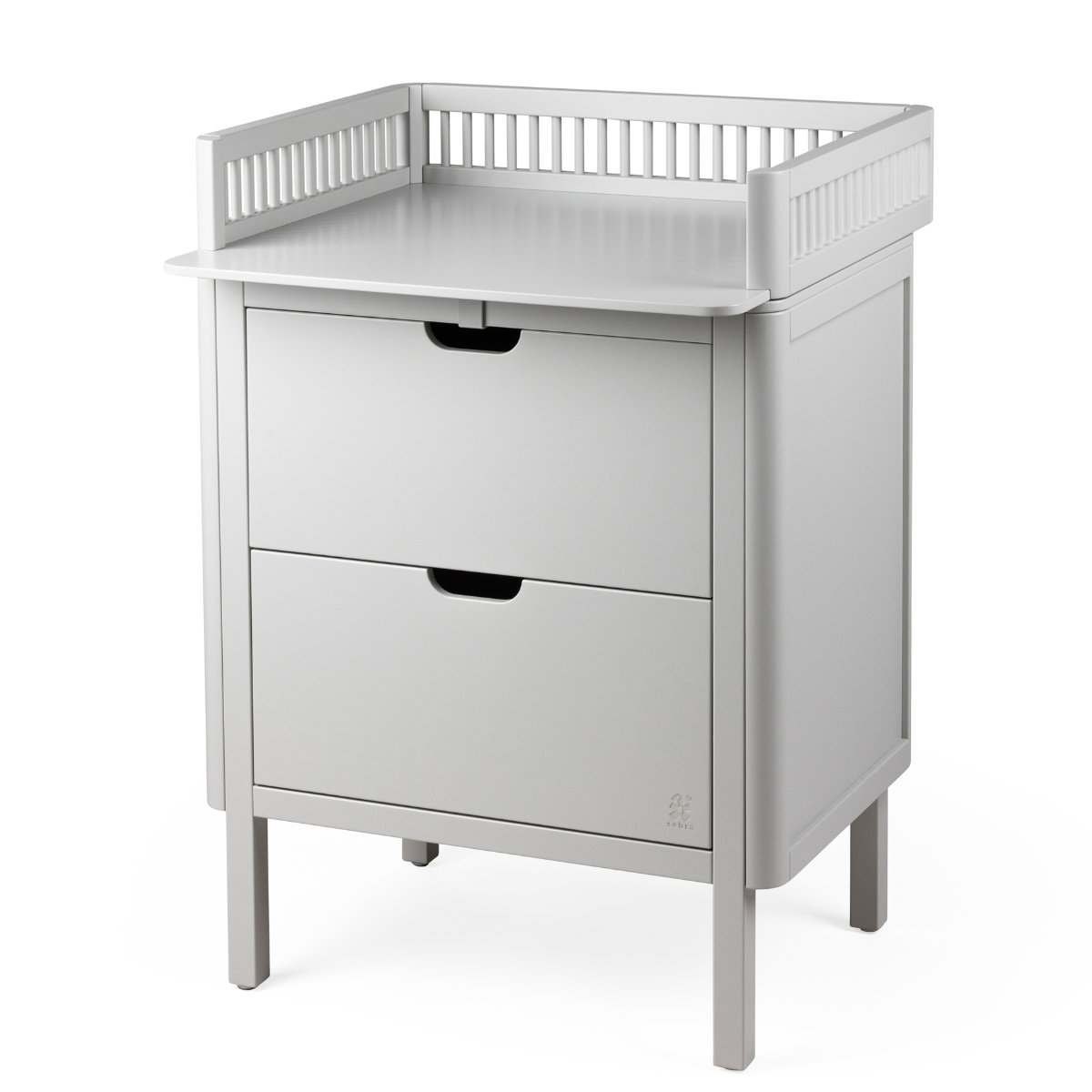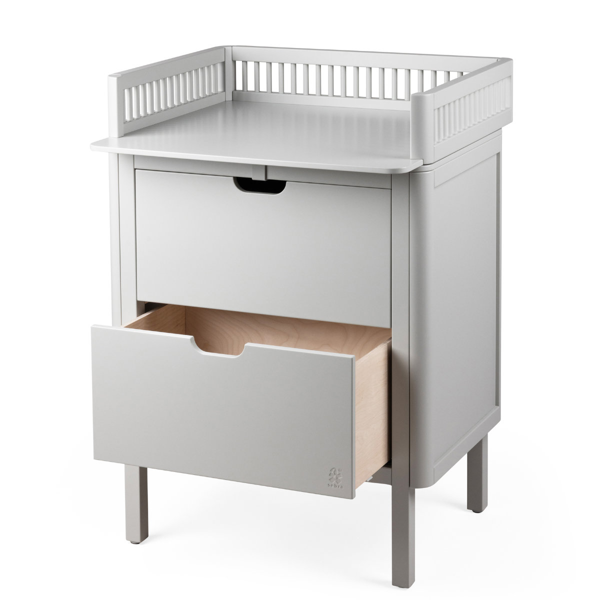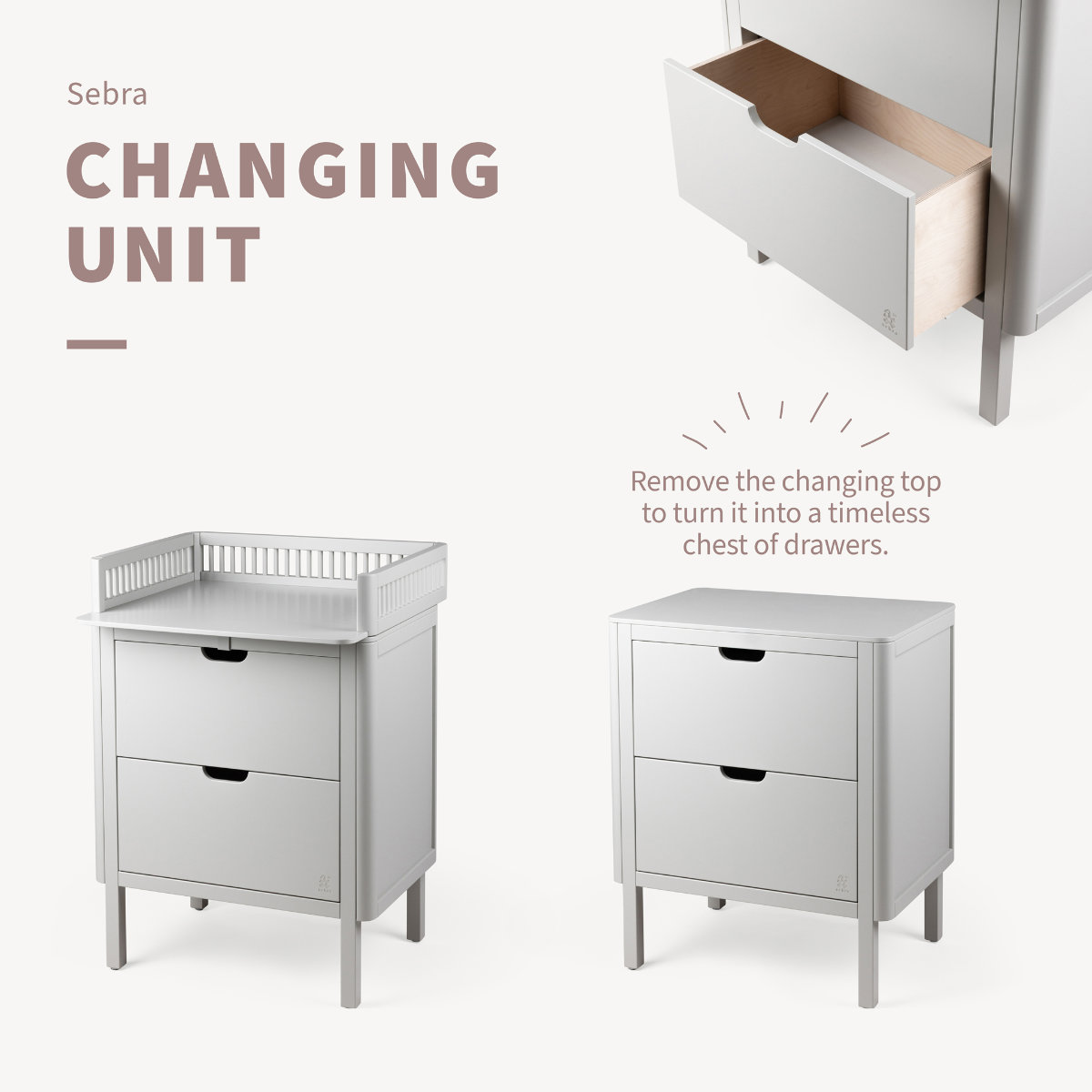 De Sebra commode is een elegant, functioneel en Deens vormgegeven 2-in-1 meubelstuk dat wordt geleverd met een commode, een verschoonblad en respectievelijk twee lades of planken met deuren, in wit of grijs.