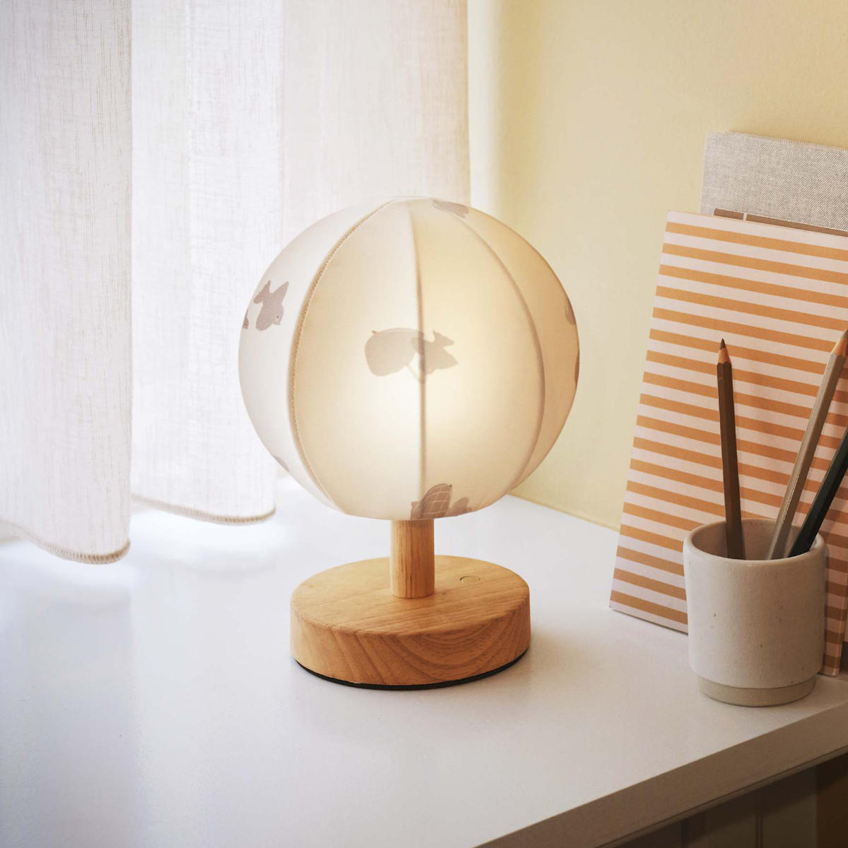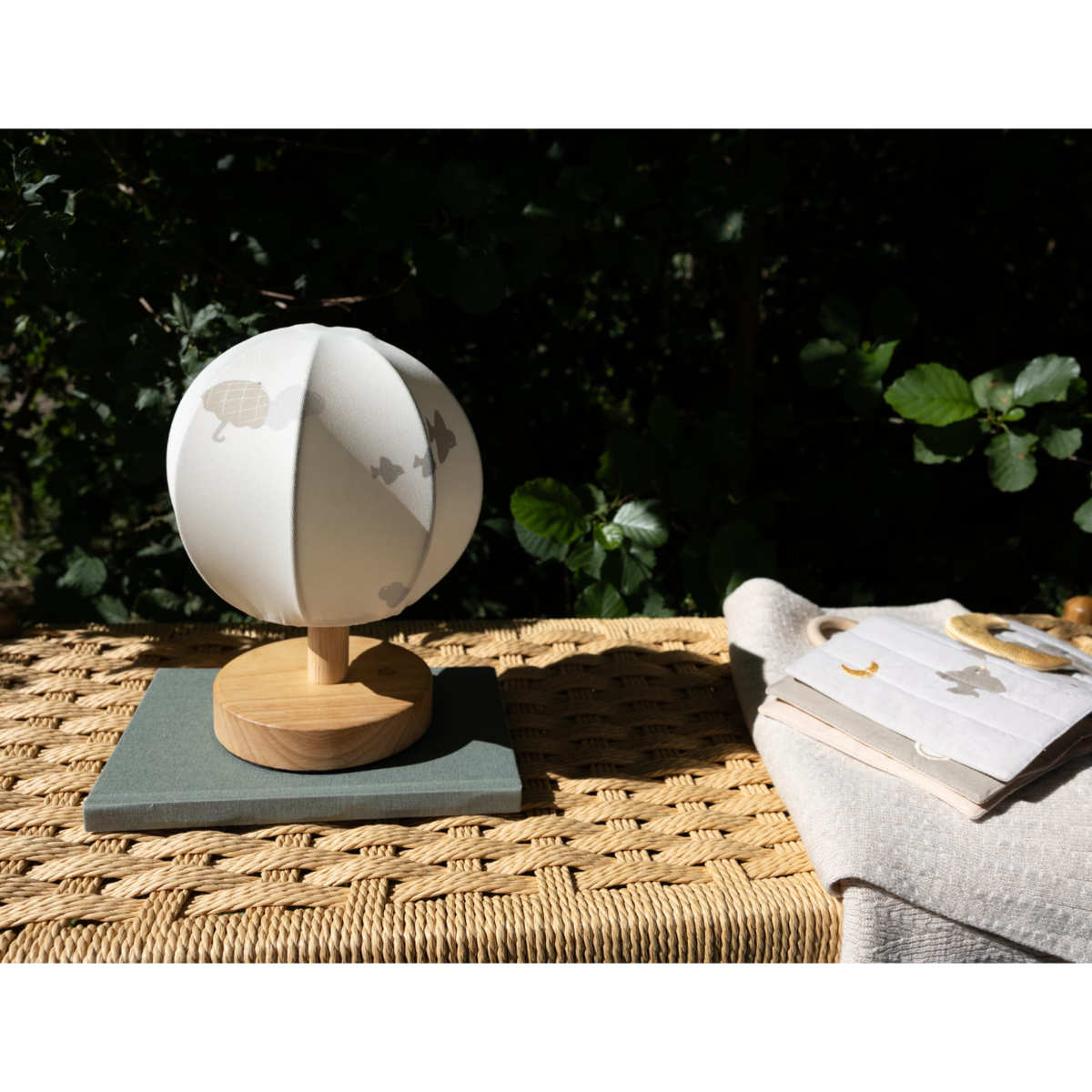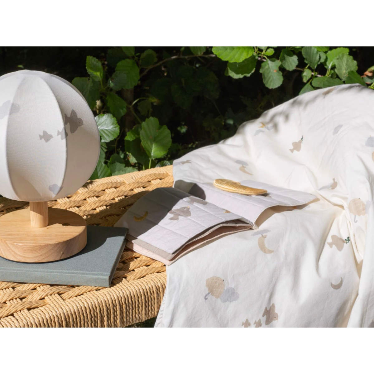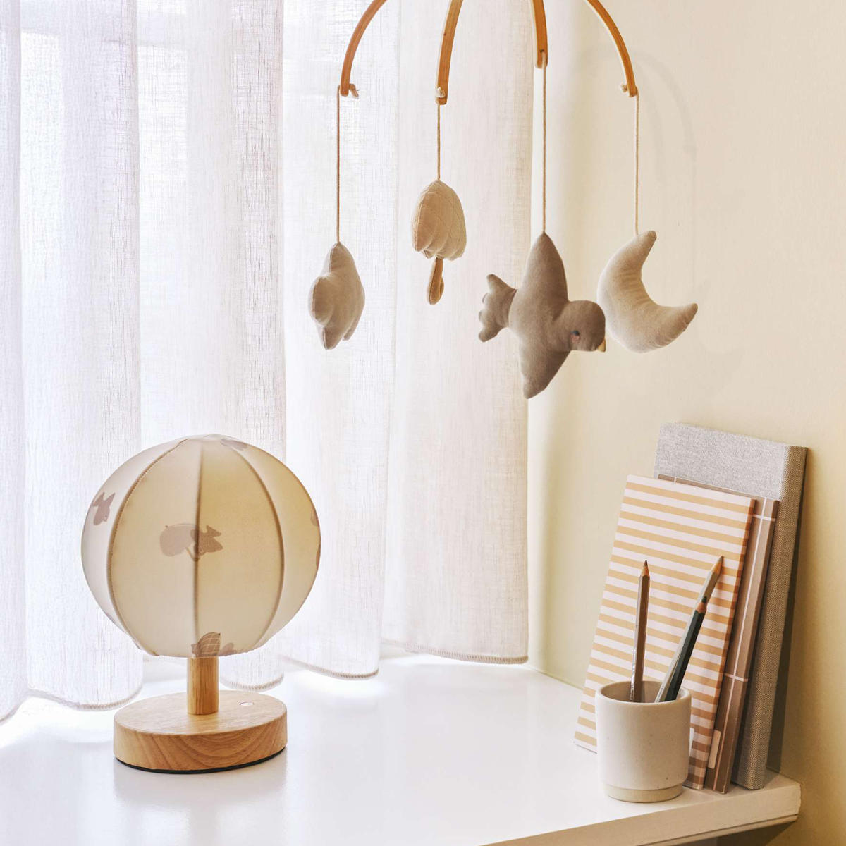 De elegante houten voet vormt de basis van de nachtlamp, terwijl de lampenkap van zacht katoenjersey verkrijgbaar is in twee betoverende motieven: “Over the Moon” en “Leaf”. Deze patronen geven de babykamer een vleugje natuur en fantasie. De zachte kleuren en liefdevolle illustraties zorgen voor een kalmerende sfeer, waarin je kindje zich veilig en geborgen kan voelen.