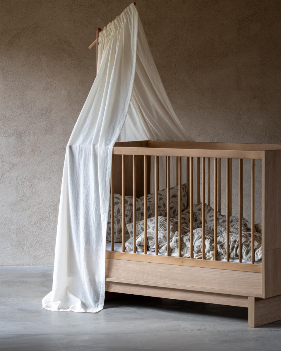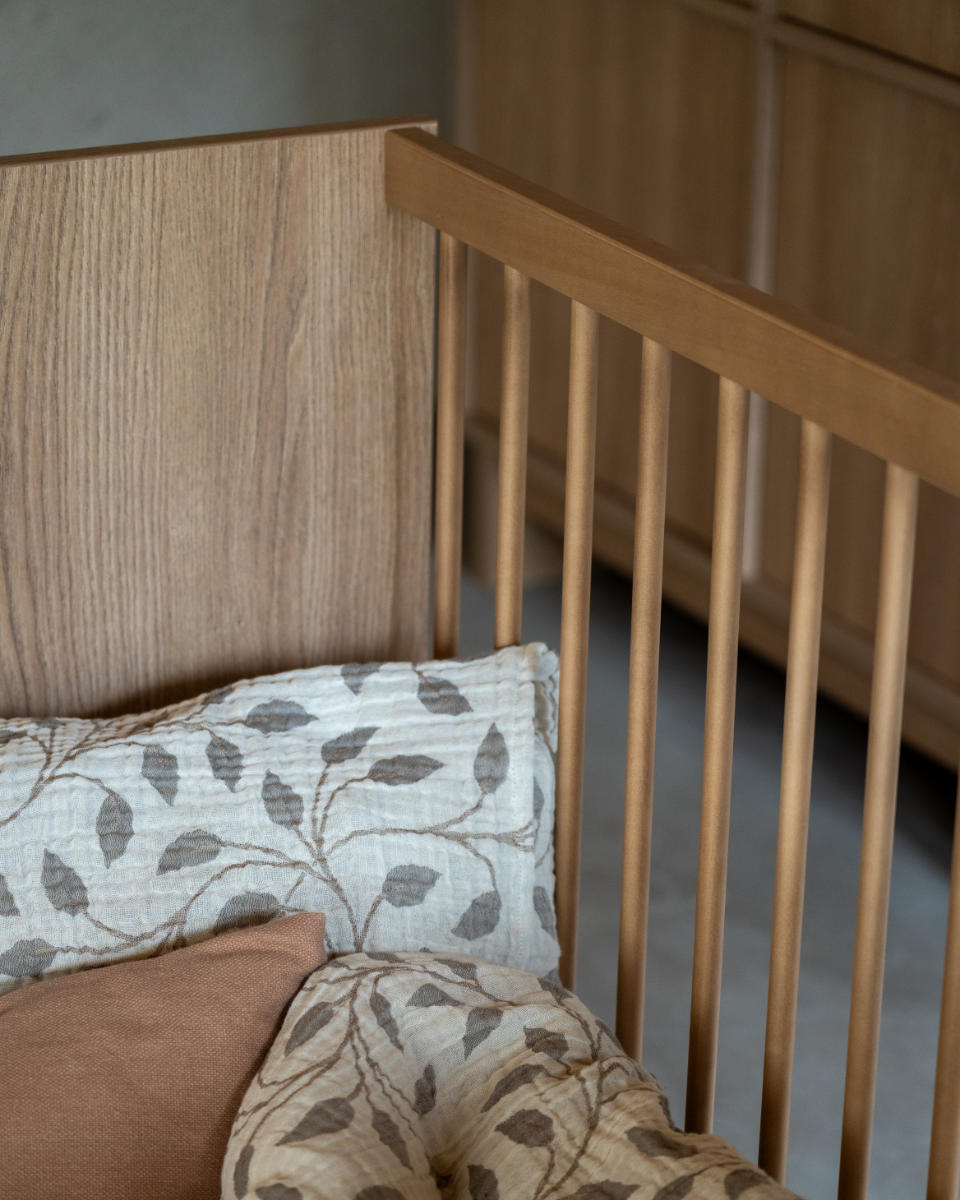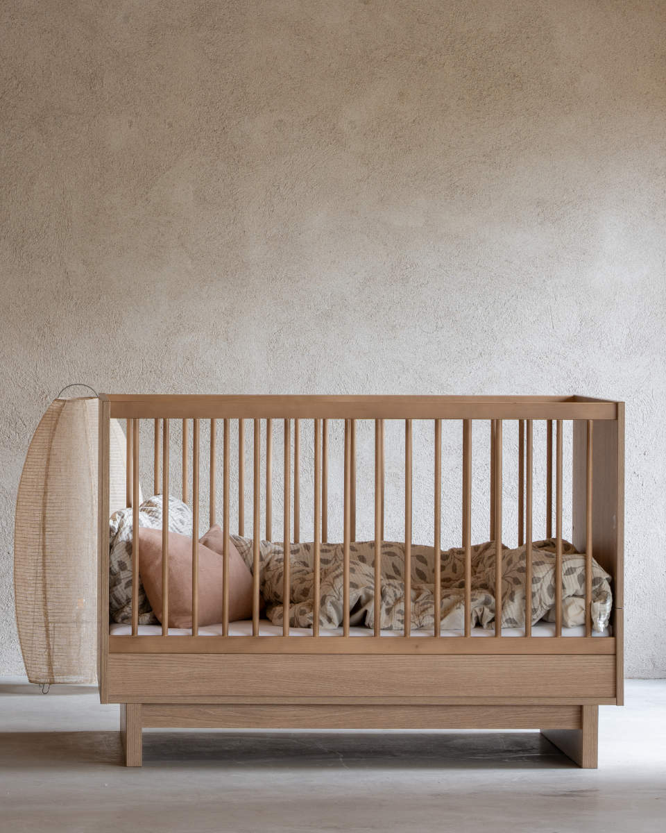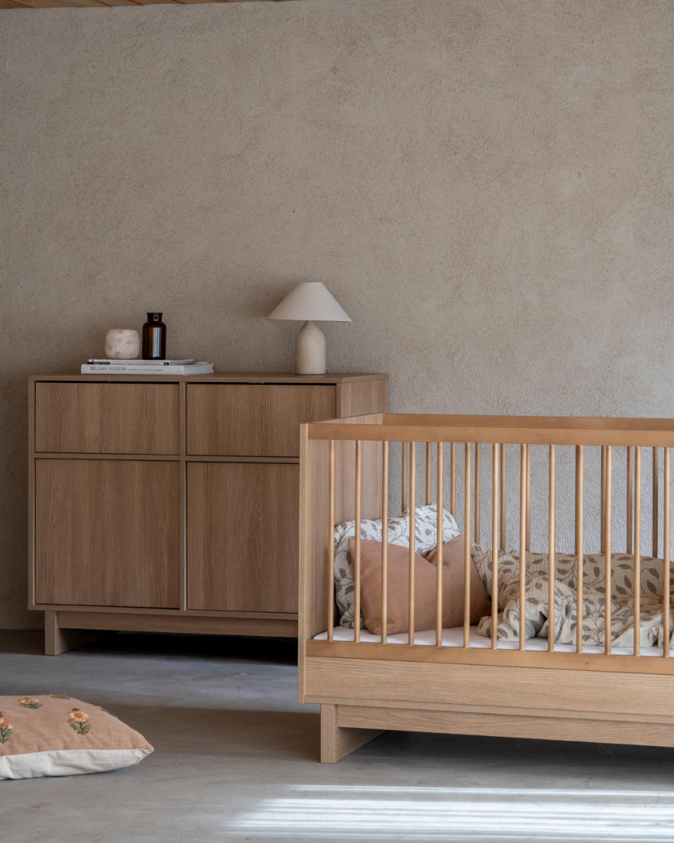 De Kyo bedden zijn verkrijgbaar in 120 × 70 cm en 140 × 70 cm. Beide modellen hebben drie hoogtes voor de lattenbodem en bieden een veilige, knusse slaapplaats vanaf dag één. Het kleinere model voelt extra knus, terwijl het grotere model meer ruimte biedt om te groeien.