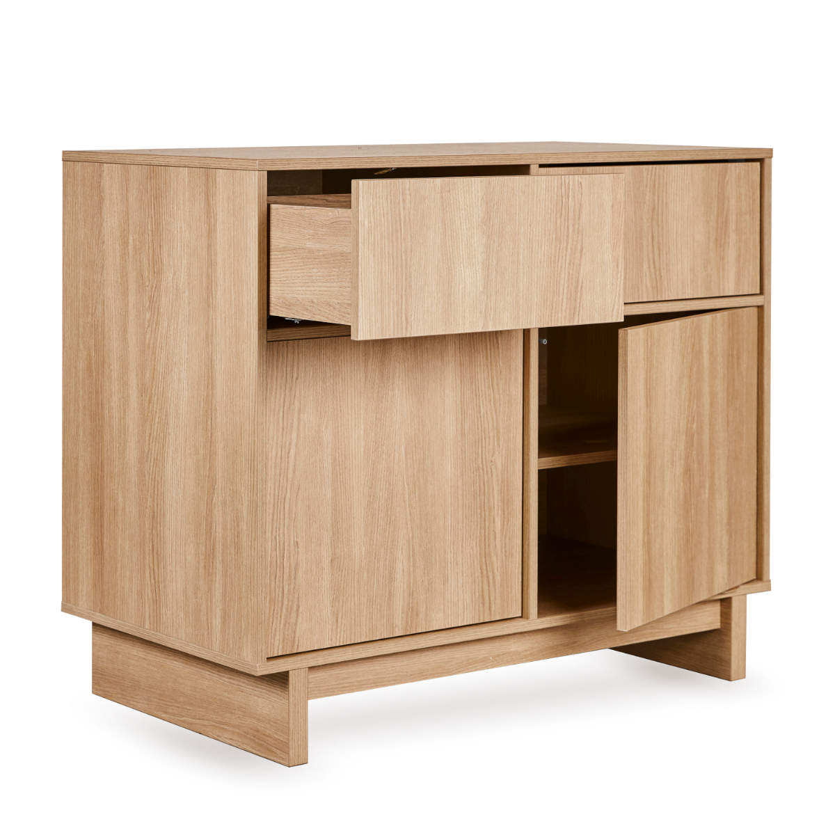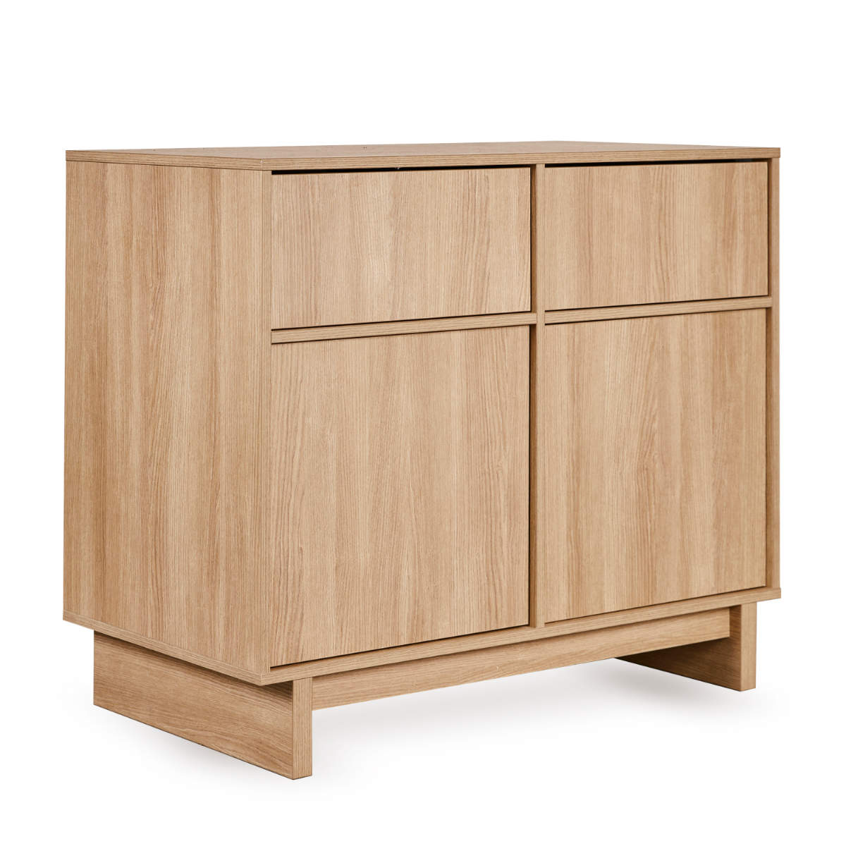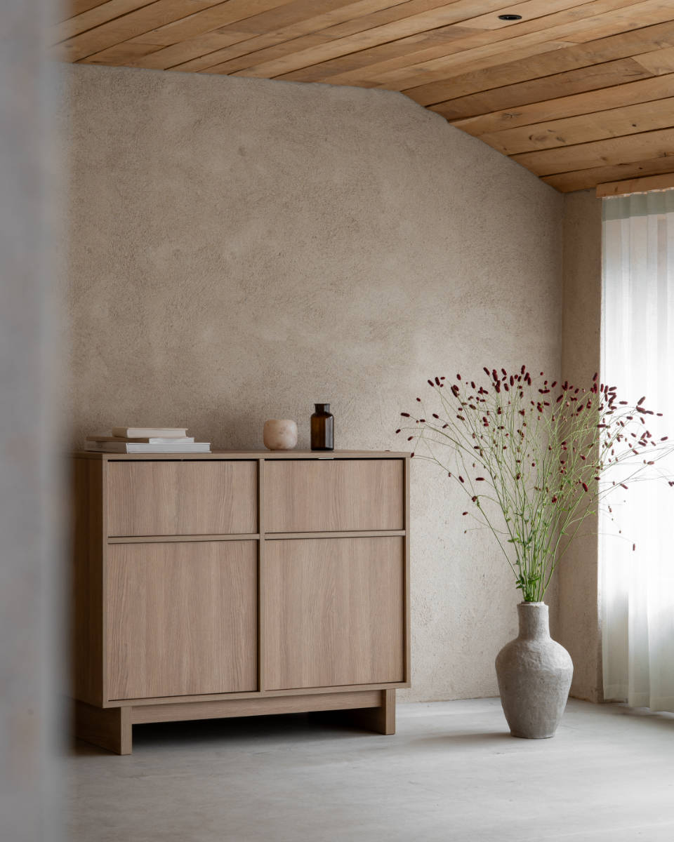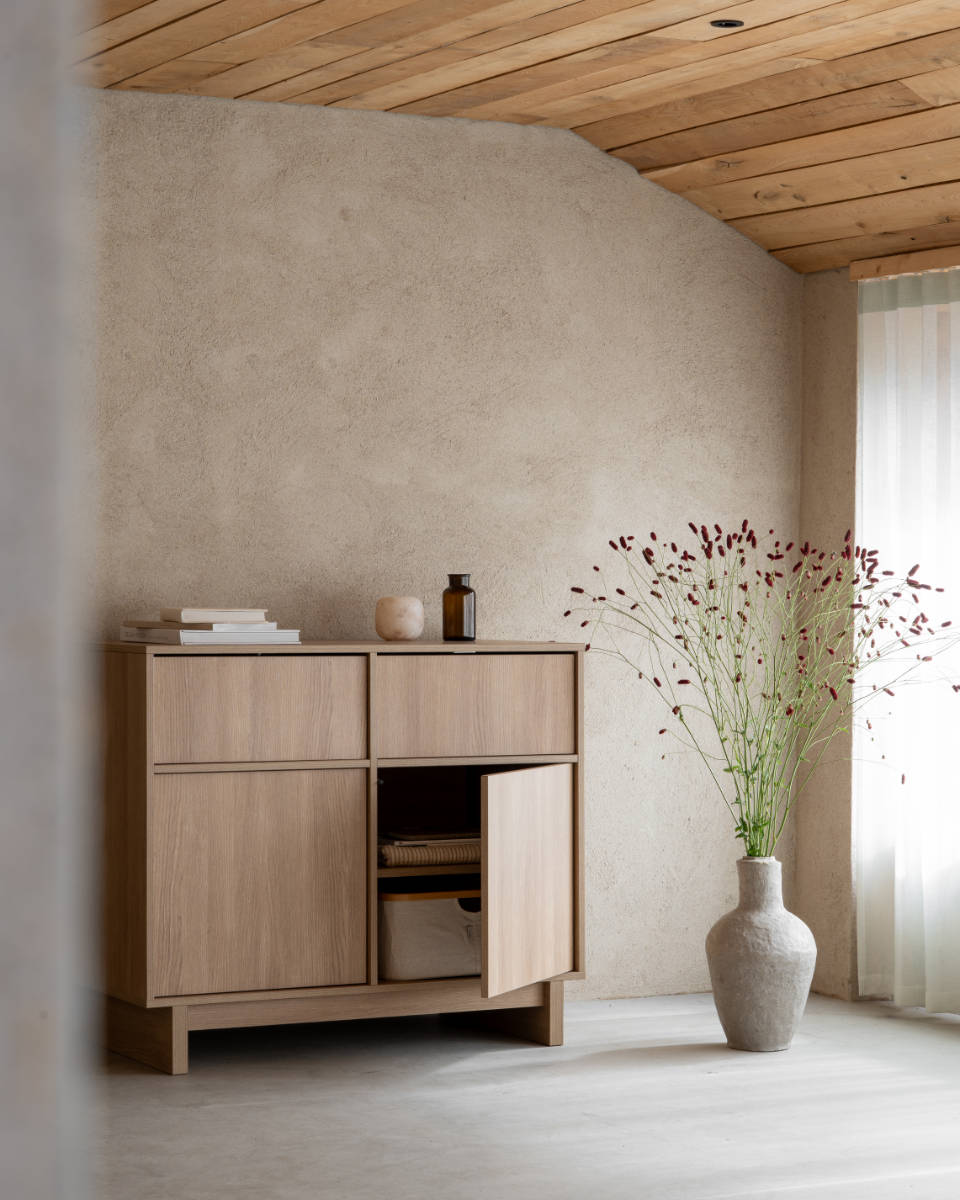 Voor orde in de kamer zorgen de Kyo commode en de grotere Kyo Commode XL. Beide hebben een strak, greeploos ontwerp met een handig push-to-open systeem. De standaardversie heeft twee deuren en twee lades, terwijl de XL-versie drie deuren en drie lades biedt.
