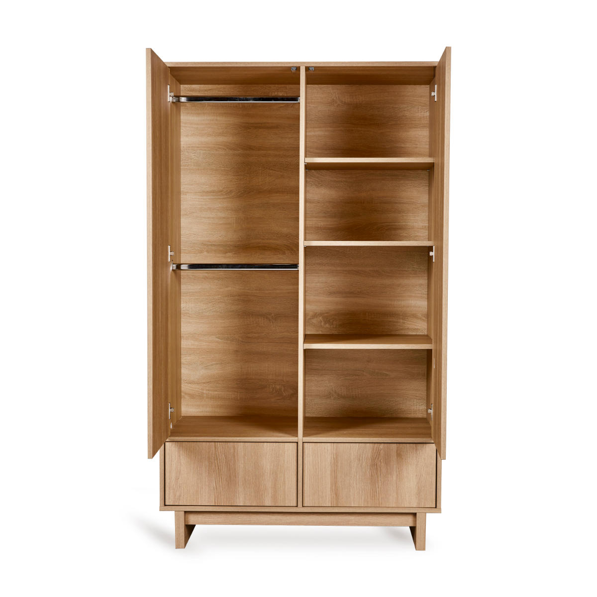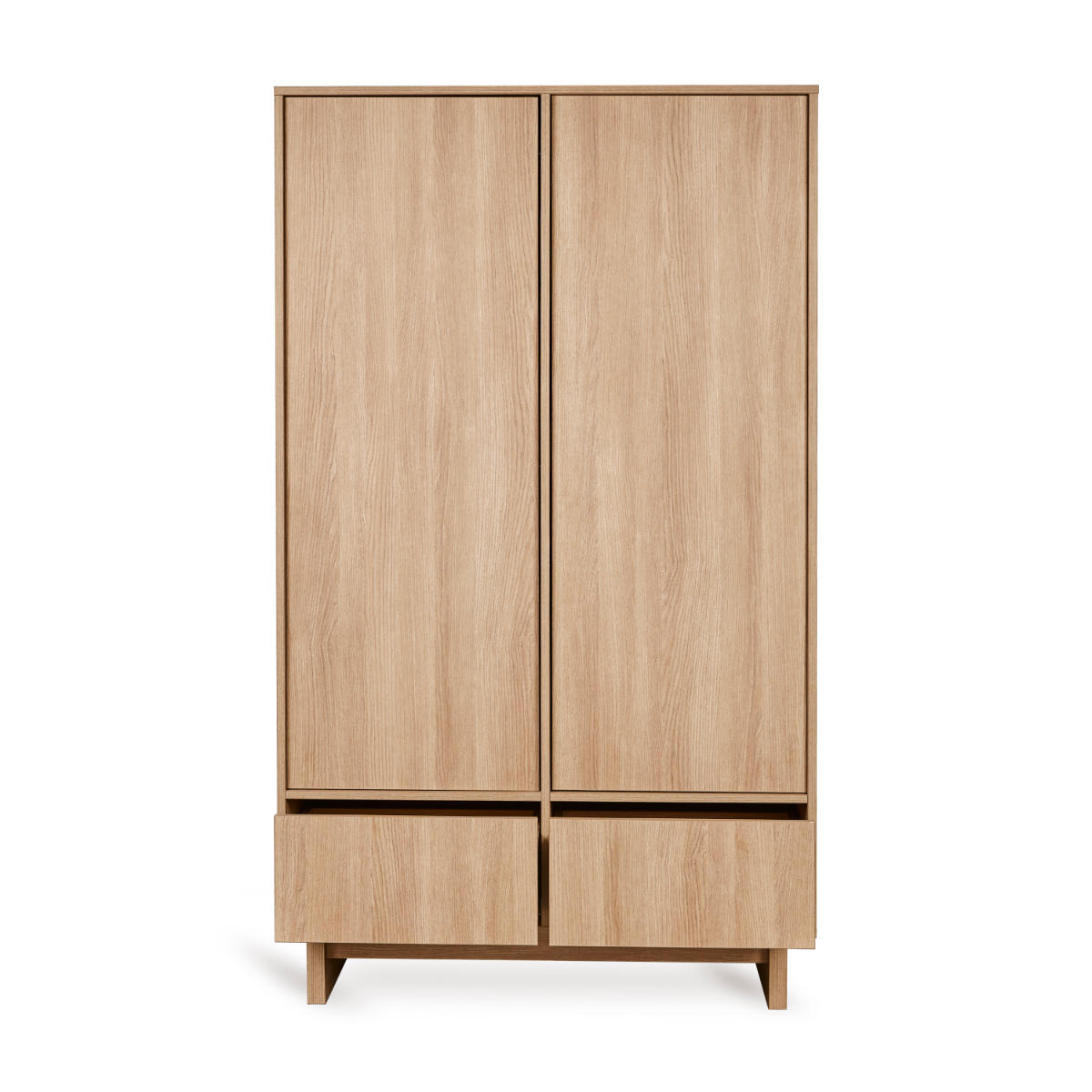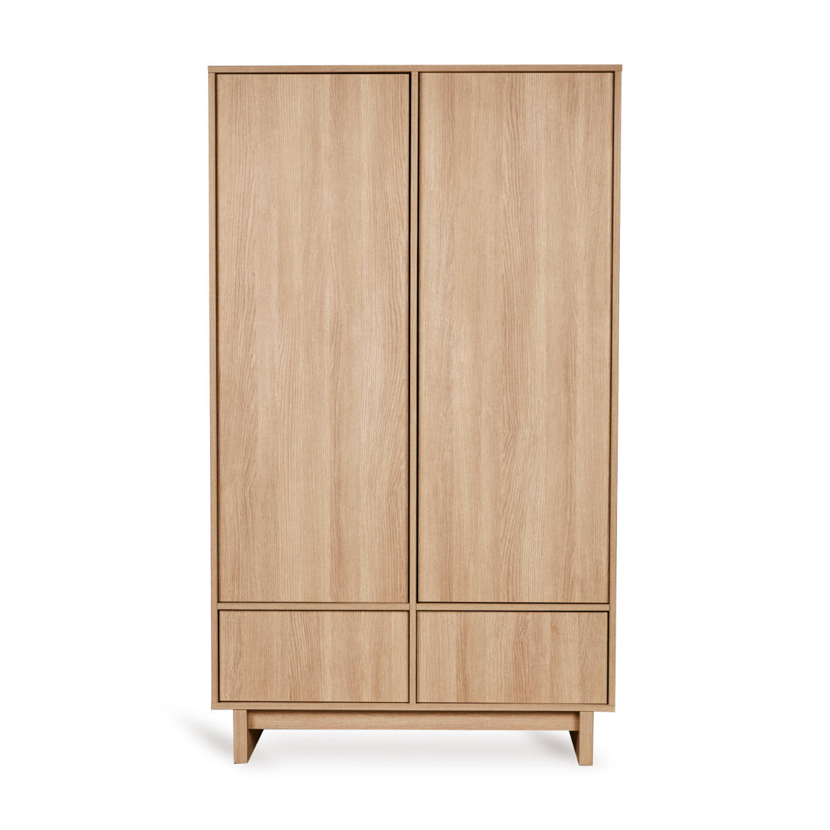 De Kyo kast is beschikbaar met 2 deuren of 3 deuren. Beide hebben verstelbare legplanken, kledingroedes en ruime lades. Door het greeploze push-to-open ontwerp blijft de kamer optisch rustig en opgeruimd.