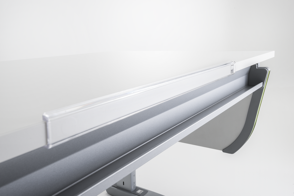 De bijpassende antislipvoorziening voor het Joker-model wordt eenvoudig op de Joker geklemd. Dit voorkomt dat boekjes, boeken en pennen eraf vallen, zelfs als het tafelblad schuin staat.