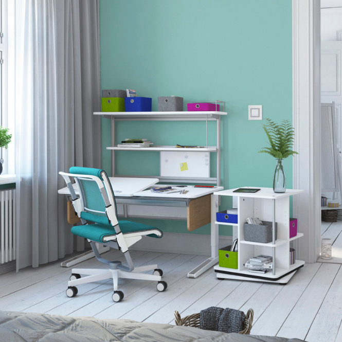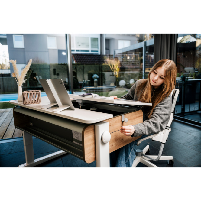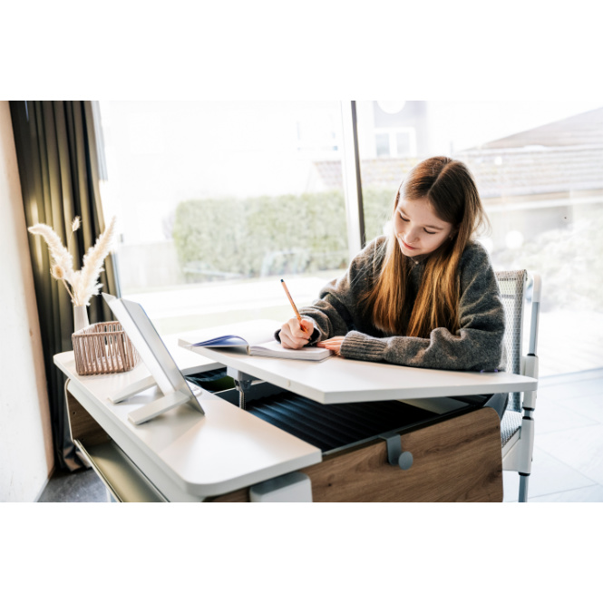 De Moll Champion schrijftafel is speciaal ontworpen om met je mee te groeien. Dankzij de traploze hoogteverstelling, het veilige kantelmechanisme en slimme uitbreidingen past deze tafel zich perfect aan jouw leeftijd en behoeften aan.