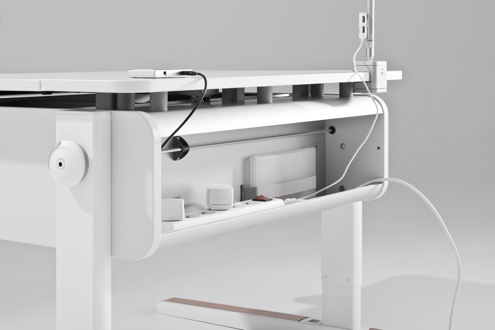 - Kabelgoot aan de achterkant van de tafel voor het opbergen van kabels en stekkers (hier vindt u ook de kleurendoos)