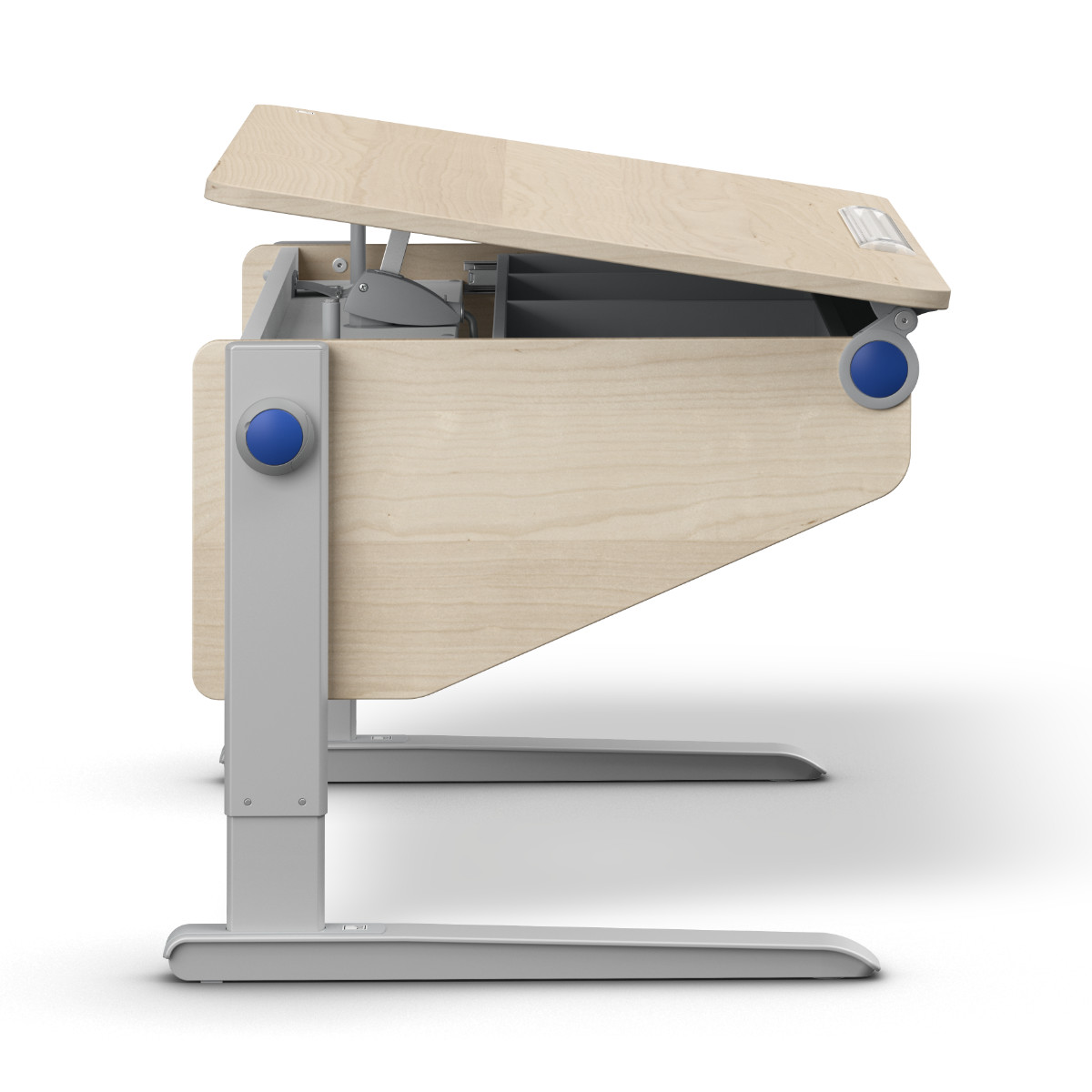 Dankzij de traploze Comfort hoogteverstelling van 53–82 cm pas je het bureau perfect aan op jouw lichaam. De kantelbare tafel (bij de Split-versie zelfs deels kantelbaar) voorkomt een verkeerde houding bij het schrijven of tekenen. Afgeronde hoeken en een rem op de kanteling zorgen voor extra veiligheid.