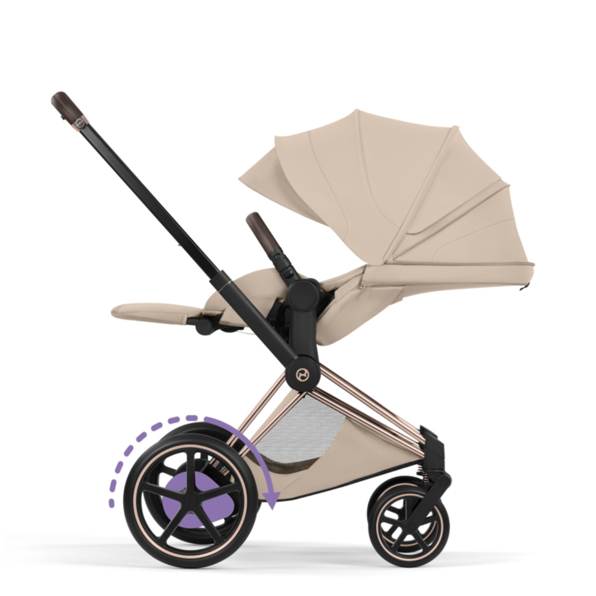 Dankzij de allround vering en slimme technologie rijdt de e-Priam soepel over elk oppervlak. Oneffenheden worden geabsorbeerd, zodat jouw kindje altijd comfortabel ligt of zit.
