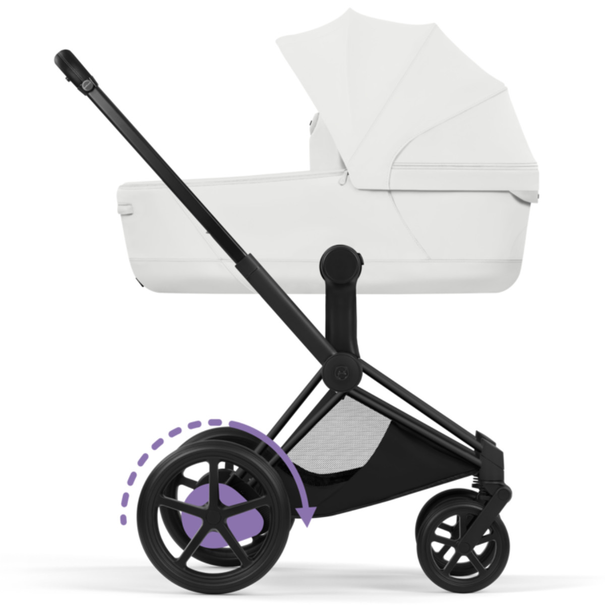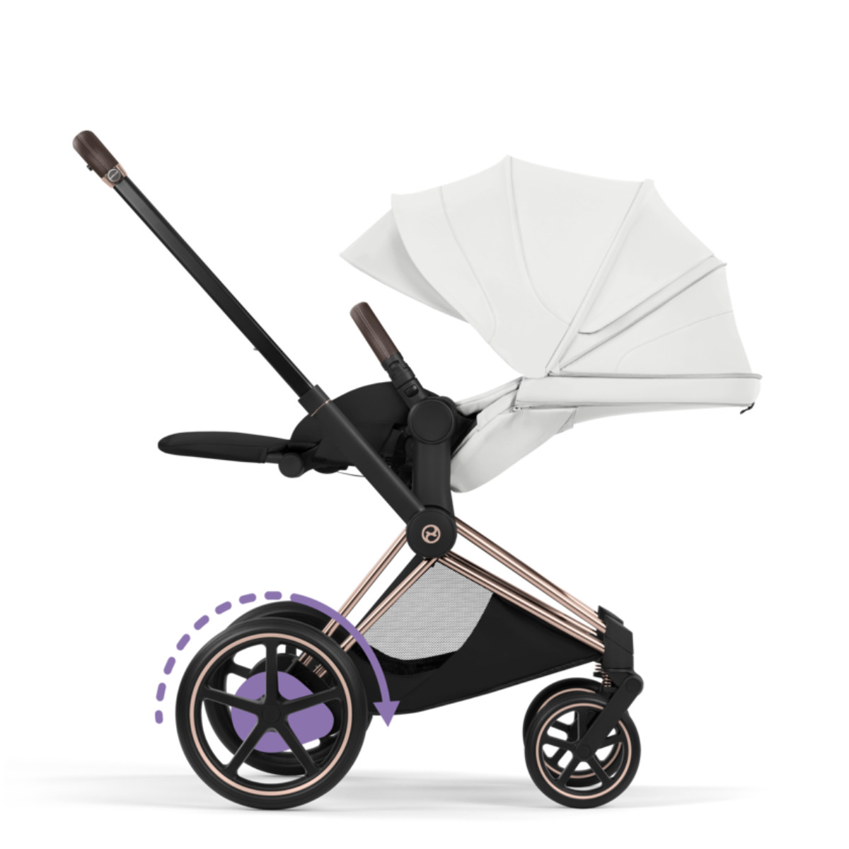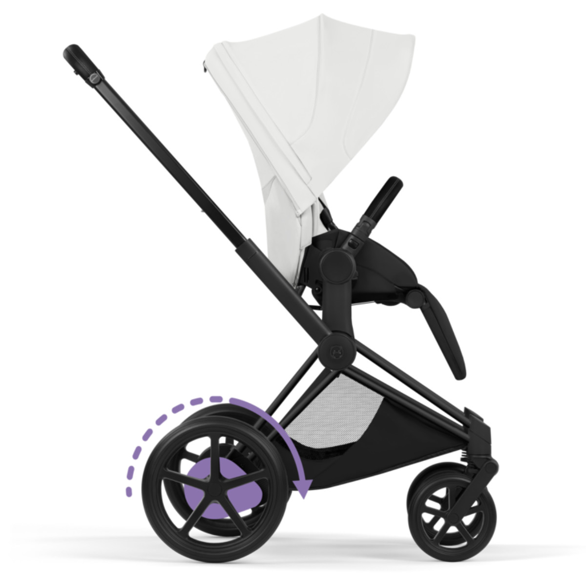 Dankzij de allround vering en slimme technologie rijdt de e-Priam soepel over elk oppervlak. Oneffenheden worden geabsorbeerd, zodat jouw kindje altijd comfortabel ligt of zit.