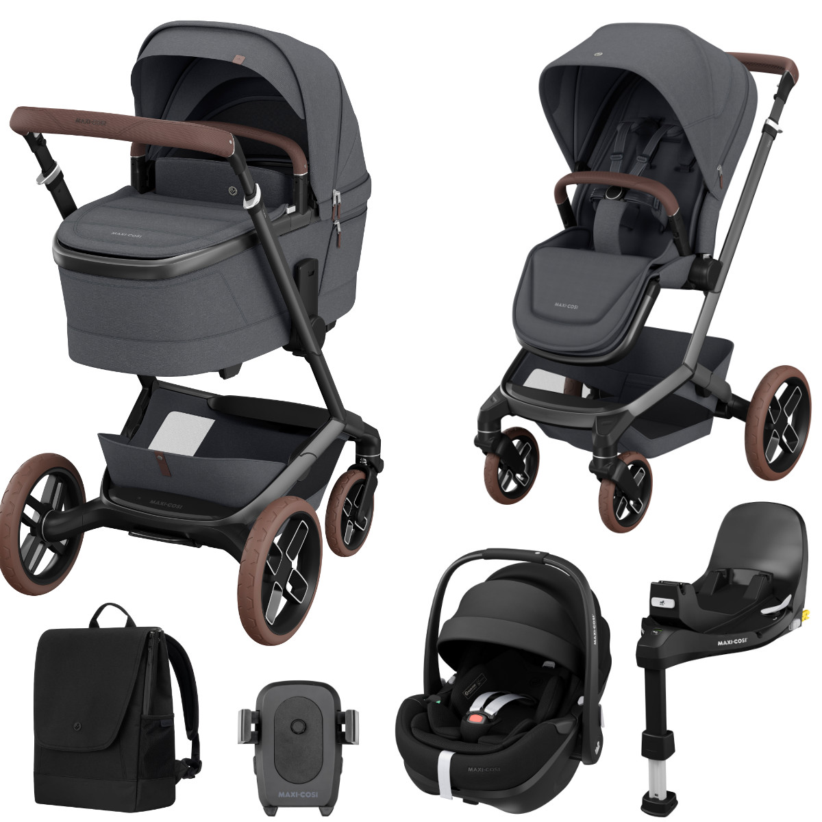 - Maxi Cosi Fame combikinderwagen (frame met boodschappenmand en geïntegreerde powerbank, ziteenheid met veiligheidsbeugel, reiswieg en adapter voor de reiswieg)
