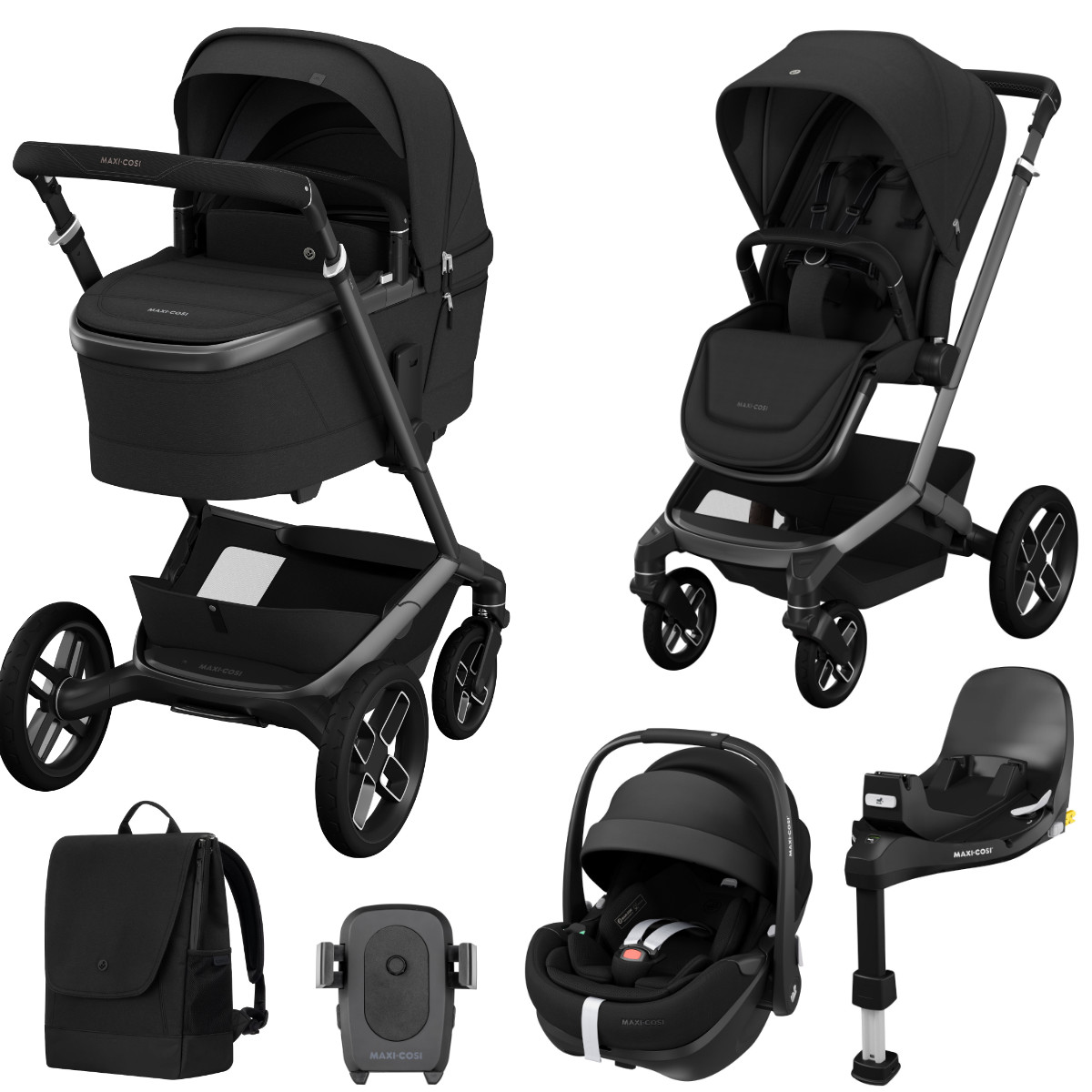 • Maxi Cosi Fame combikinderwagen (frame met boodschappenmand en geïntegreerde powerbank, ziteenheid met veiligheidsbeugel, reiswieg en adapter voor de reiswieg)
