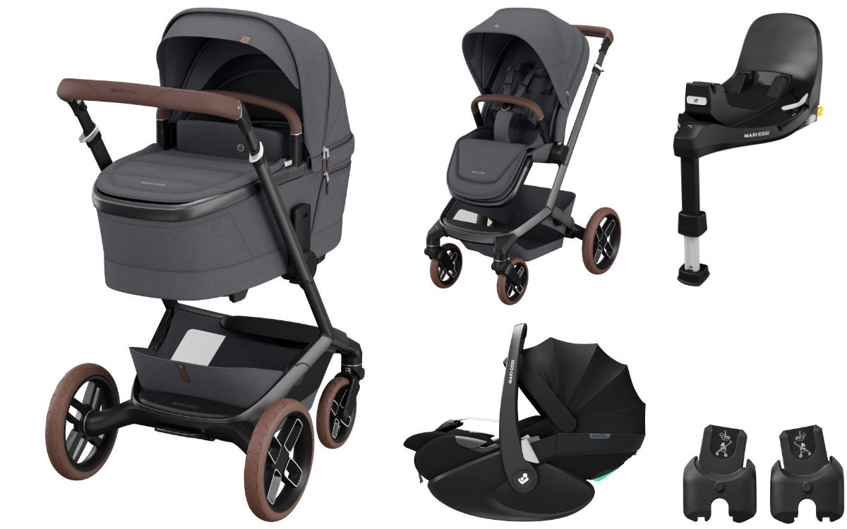 - Maxi Cosi Fame combikinderwagen (frame met boodschappenmand en geïntegreerde powerbank, ziteenheid met veiligheidsbeugel, reiswieg en adapter voor de reiswieg)