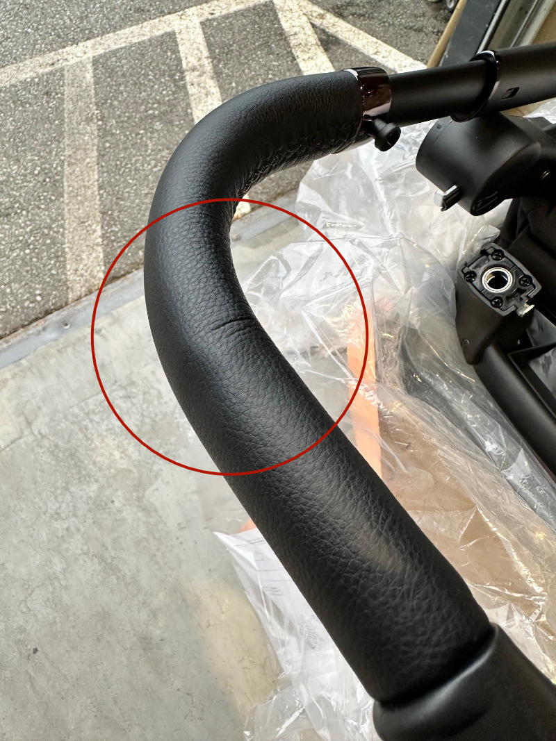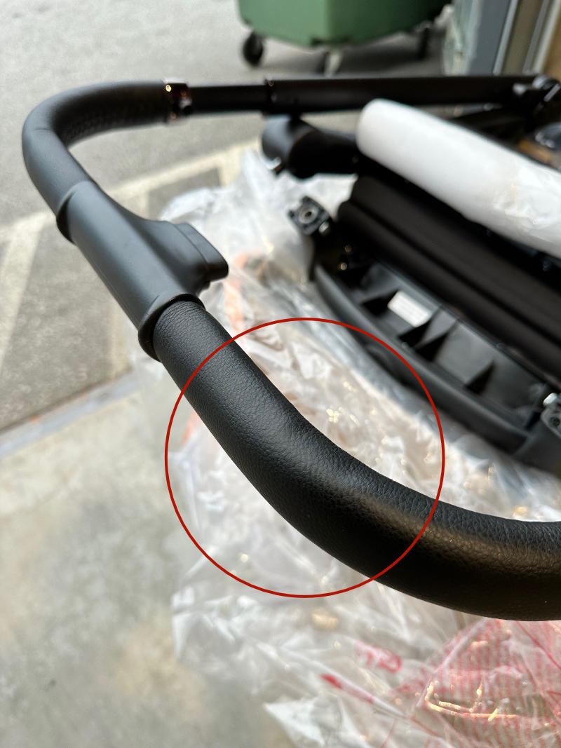 De kinderwagen heeft een paar lichte deukjes in de greep.