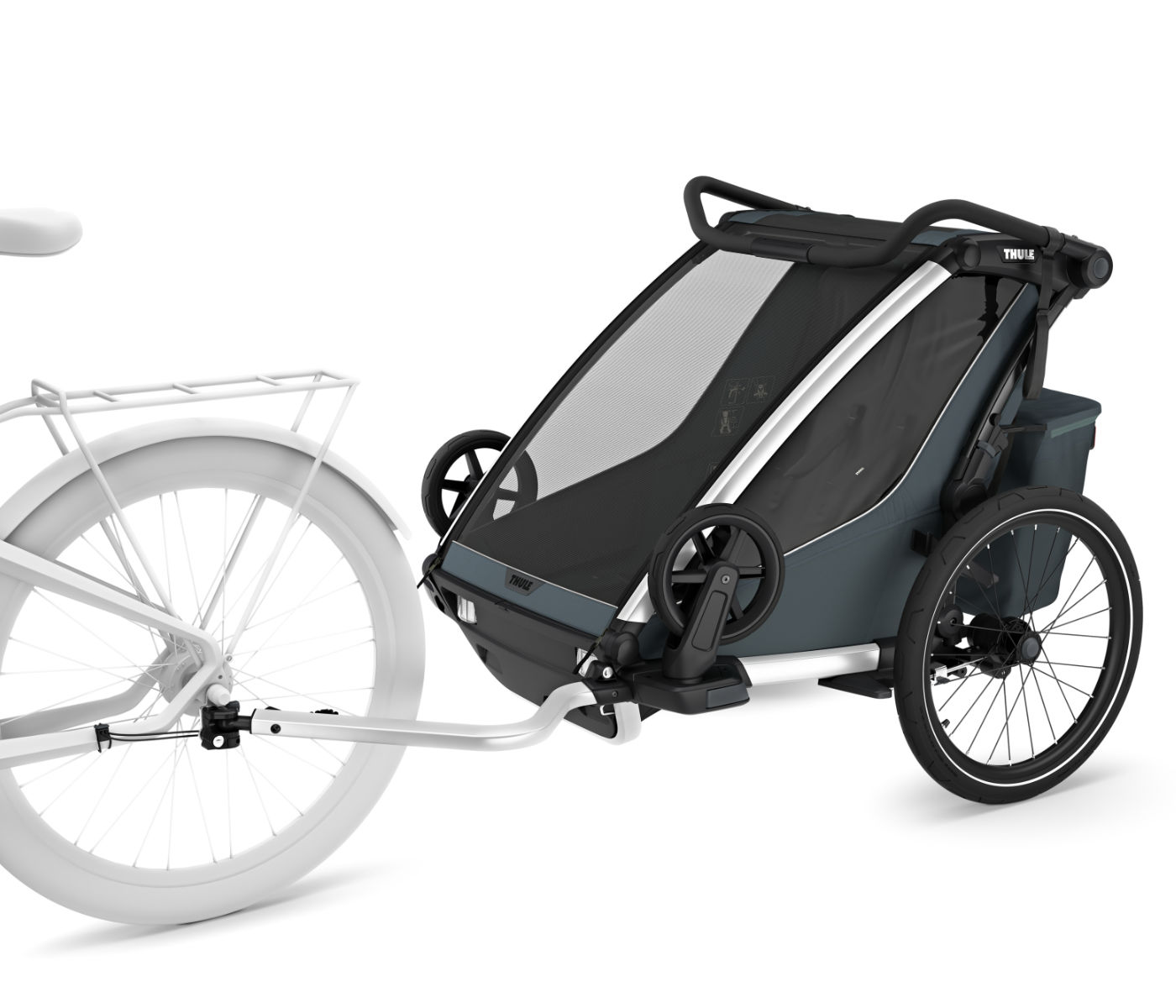 - Een snellere, met één hand bedienbare 180-graden wielrotatie maakt het mogelijk om de aanhanger snel om te toveren tot een kinderwagen.