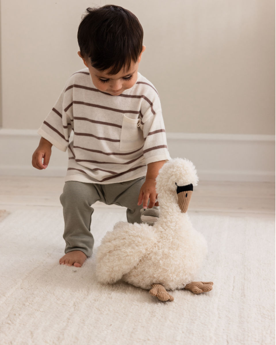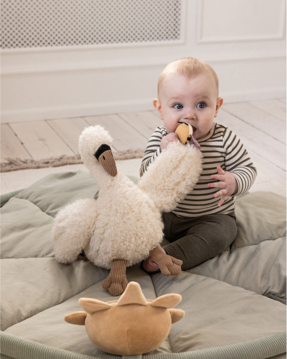 De vleugels van de zwaan zijn voorzien van klittenband. Hierdoor kun je ze vastzetten of openen, wat de fijne motoriek van je kindje traint. Of het nu een knuffelmaatje in bed is, een spannend speeltje overdag of een decoratief element op de plank – deze zwaan past zich aan elke situatie aan. Dankzij de vulling van gerecycled polyester is het bovendien een duurzame keuze voor milieubewuste ouders.