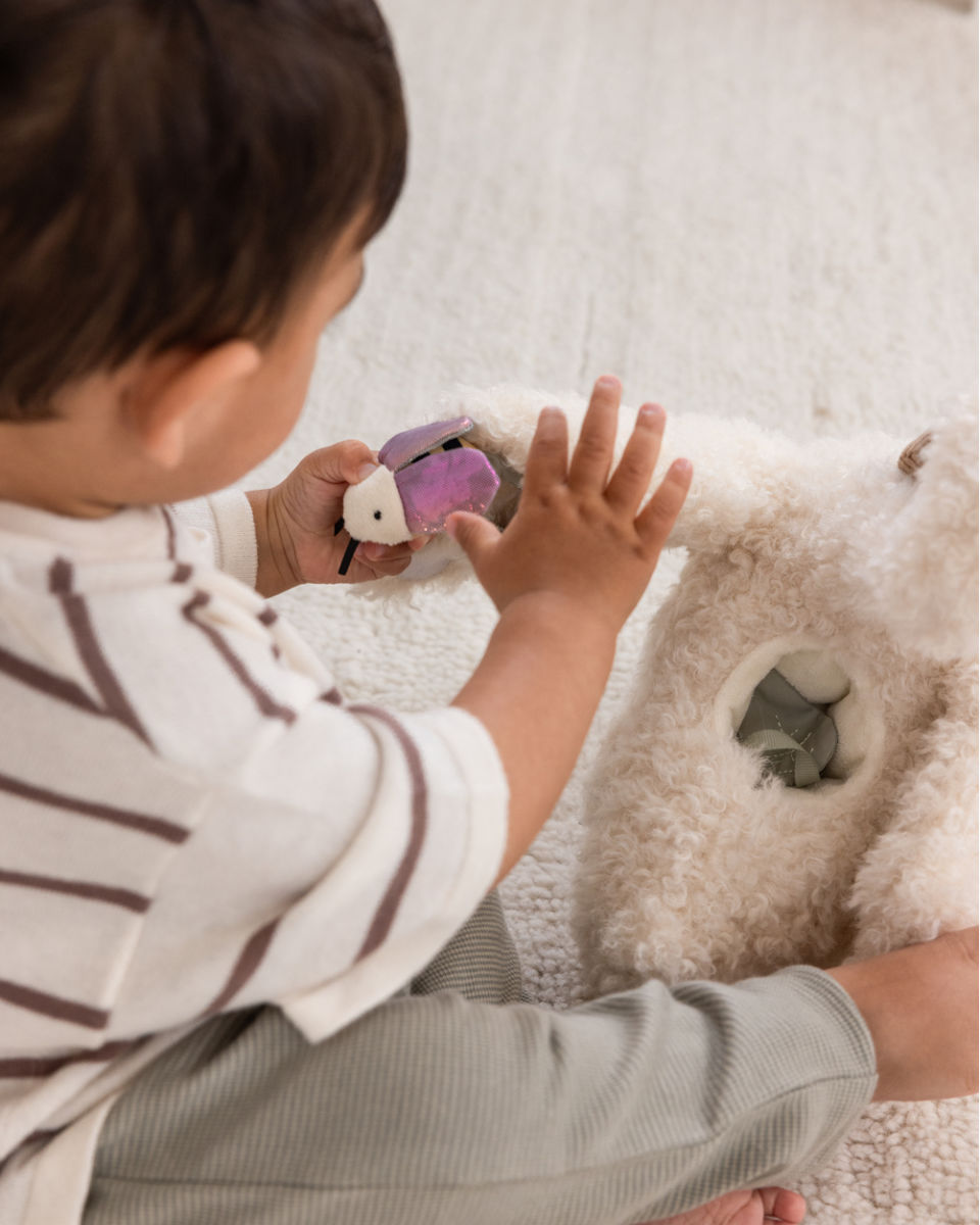 Je kindje zal het heerlijk vinden om de kleine verrassingen van deze zwaan te verkennen. Op zijn rug draagt hij een kleine kikker die eruit gehaald kan worden en grappige geluidjes maakt als je ermee schudt. Maar dat is nog niet alles: onder een van de zachte vleugels zit een rammelende bij verstopt in een klein zakje, wachtend om ontdekt te worden tijdens een spelletje kiekeboe.