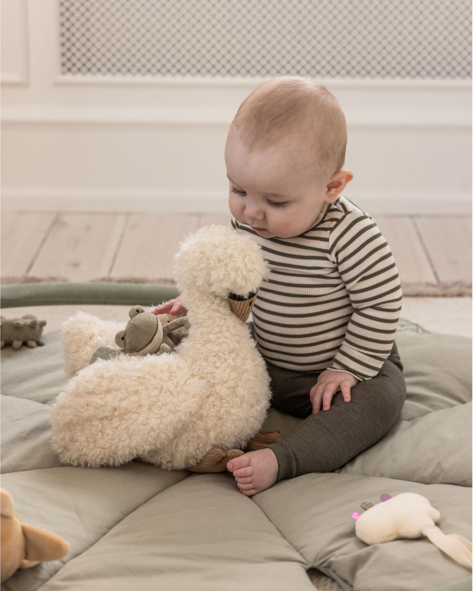 De Sebra Activiteitszwaan is een schoolvoorbeeld van "Meaningful Play". We houden vooral van de veelzijdigheid: hij is net zo zacht als een klassieke knuffel, maar biedt langdurige speelwaarde door de ingebouwde rammelaars en de uitneembare kikker. Het stimuleert de hand-oogcoördinatie op een zeer zachte manier. Een ideaal geboortecadeau dat functionaliteit en Deense esthetiek perfect combineert.