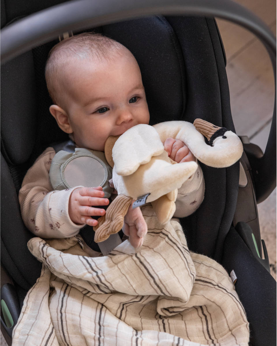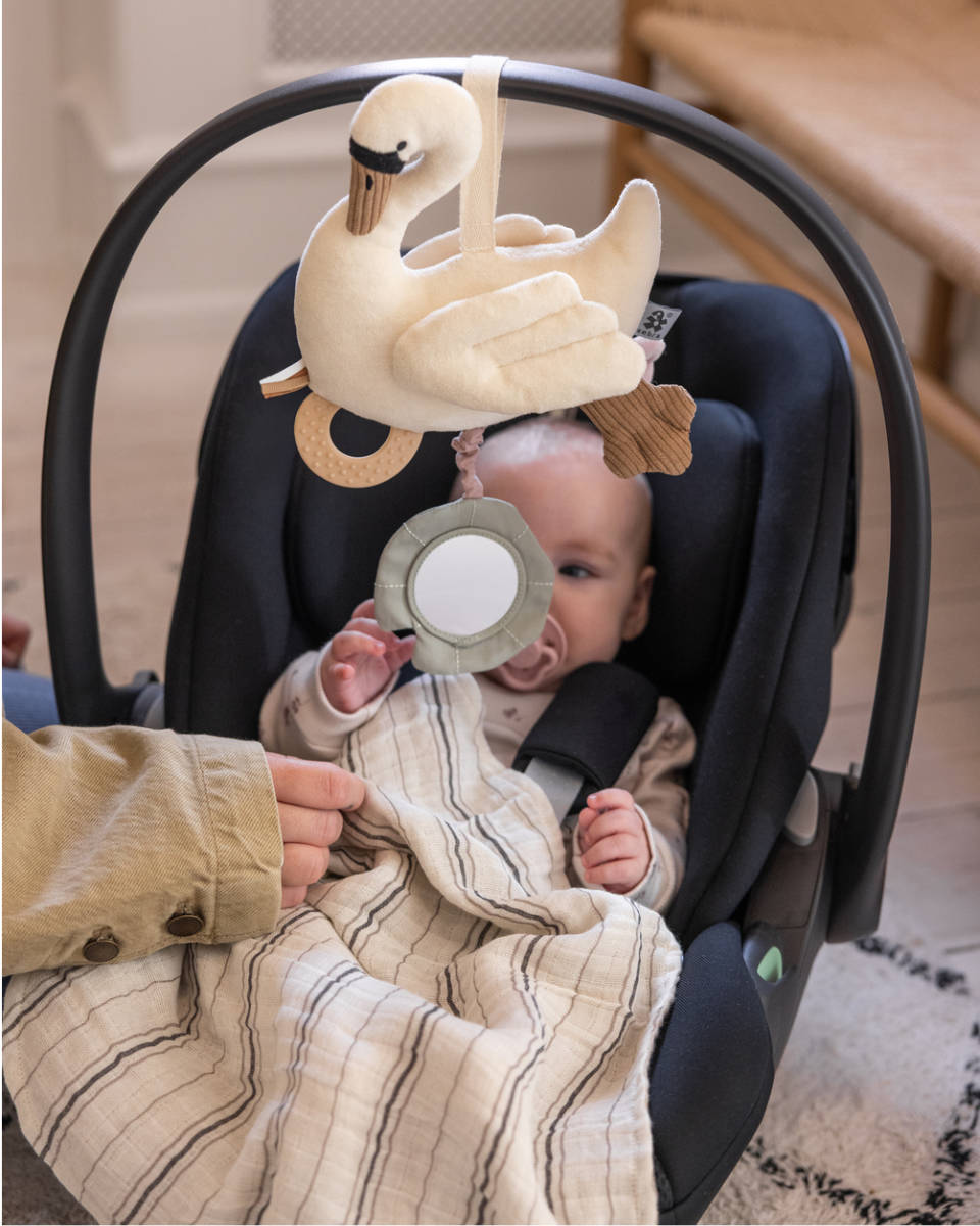 Wij zijn dol op het Sebra activiteitenspeelgoed omdat het perfect aansluit bij “Play the day away!”. Het is niet alleen een mooie accessoire voor de kinderwagen, maar ook een doordacht leerspeeltje. Vooral de vibratiefunctie van de zwaan (bij het trekken aan het spiegeltje) zorgt voor verwonderde blikken bij de allerkleinsten. Een hoogwaardig en duurzaam item voor ouders die design en functionaliteit waarderen.