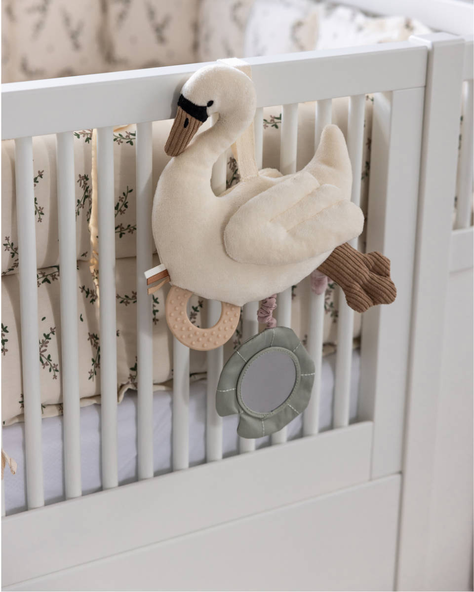 Welke uitvoering je ook kiest, je baby zal het geweldig vinden om de verschillende functies te ontdekken. De zwaan verrast met knisperende vleugels, diverse voelstructuren en een verborgen spiegeltje in het blad. De libel stimuleert daarentegen het gehoor en het zicht met zachte rammelgeluiden en glinsterende stoffen. Dankzij de praktische klittenbandsluiting bevestig je het speelgoed eenvoudig waar je baby het nodig heeft.