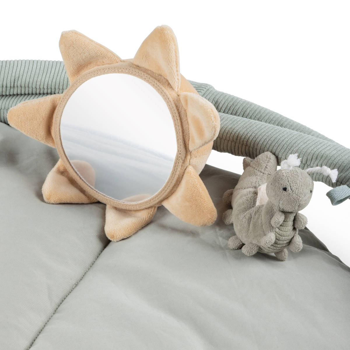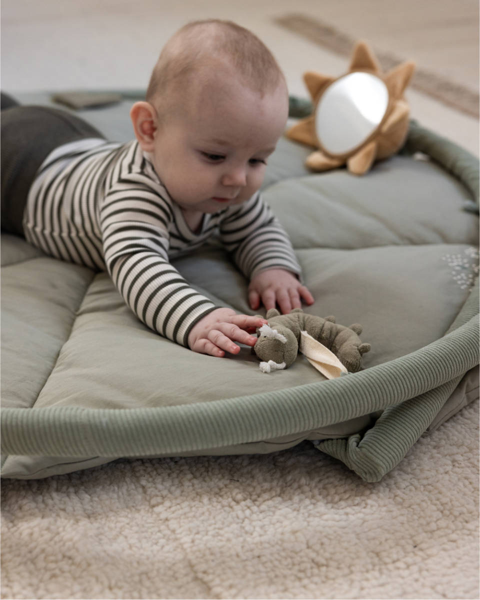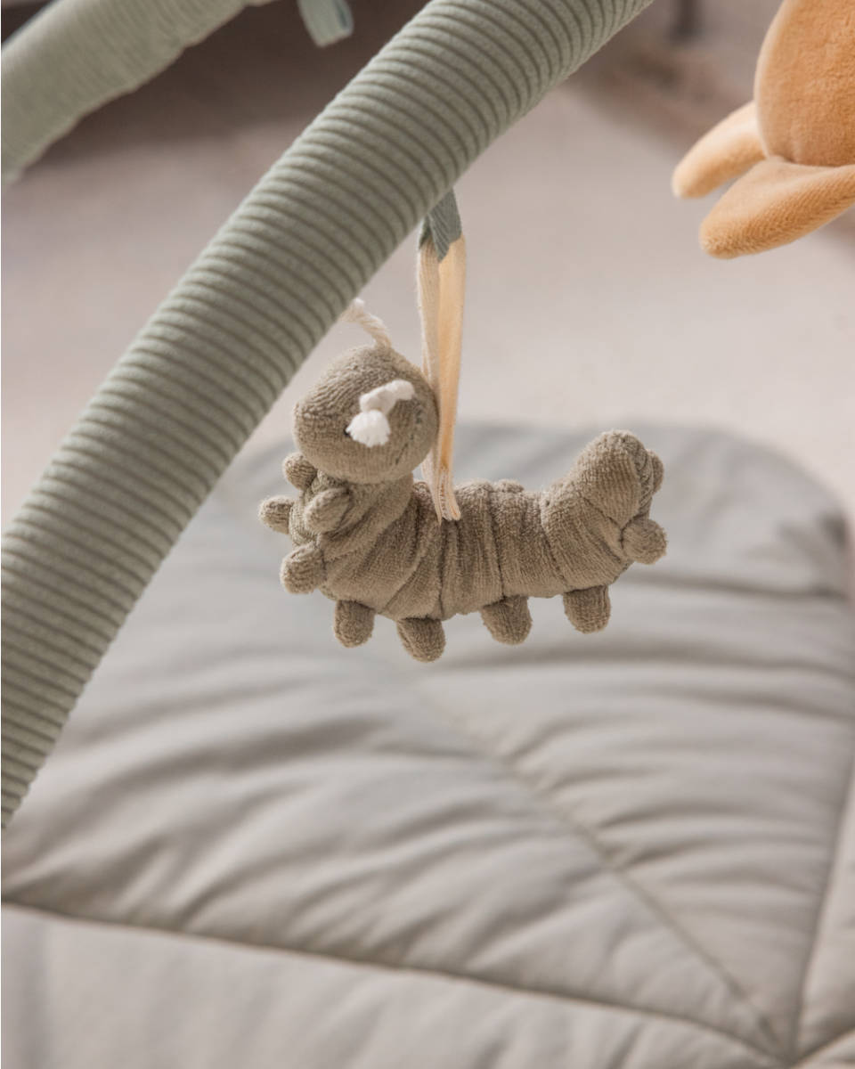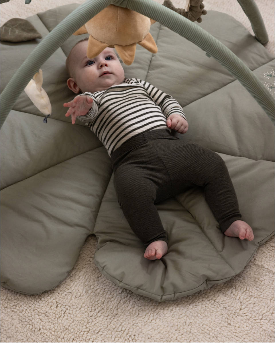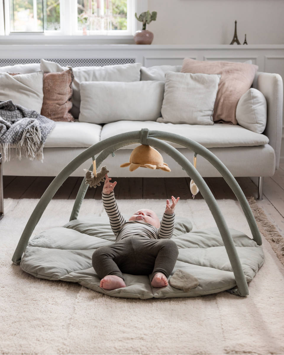 De zachte bogen zijn eenvoudig te bevestigen, waardoor het meegeleverde speelgoed vrij kan hangen en je baby wordt aangemoedigd om de eerste gerichte grijppogingen te doen. Wanneer de bogen worden neergelegd, verandert de mat in een ideale ondergrond voor belangrijke rug-, nek- en draaioefeningen. De begrenzing door de bogen zorgt ervoor dat het speelgoed altijd binnen handbereik blijft en stimuleert zo het optillen van het hoofdje en het versterken van de spieren.