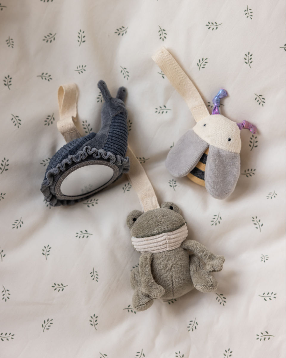 - Kikker, Bij & Slak: Een piepende kikker, een rammelende bij en een slak met een babyveilige spiegel voor de eerste zelfherkenning.