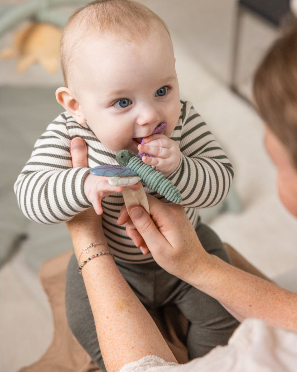 • Bloem, Libel & Zwaan: Een zachte bloem met grijpelementen, een libel met glanzende knispervleugels en een elegante zwaan met een geïntegreerd rammelgeluid.