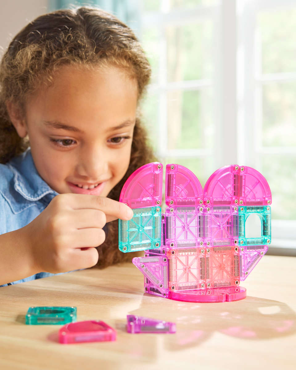 Het Magna-Tiles Heart to Heart set is een echte blikvanger voor iedereen die houdt van glitter en creatief bouwen. Vooral de nieuwe vormen, zoals boogramen en kwartcirkels, bieden volop mogelijkheden voor verfijnde en fantasierijke ontwerpen. Perfect als cadeau of voor lange autoritten – dit compacte set zorgt gegarandeerd voor uren speelplezier.