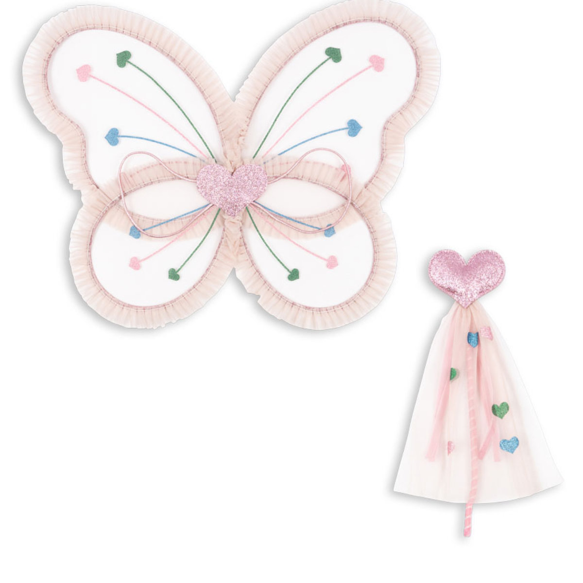 De transparant glinsterende feeënvleugels schitteren in het licht en zijn dankzij de lichte bandjes comfortabel om te dragen. De bijpassende toverstaf met hartdetail maakt het kostuum compleet en nodigt uit tot fantasierijk spelen, dansen en dromen.