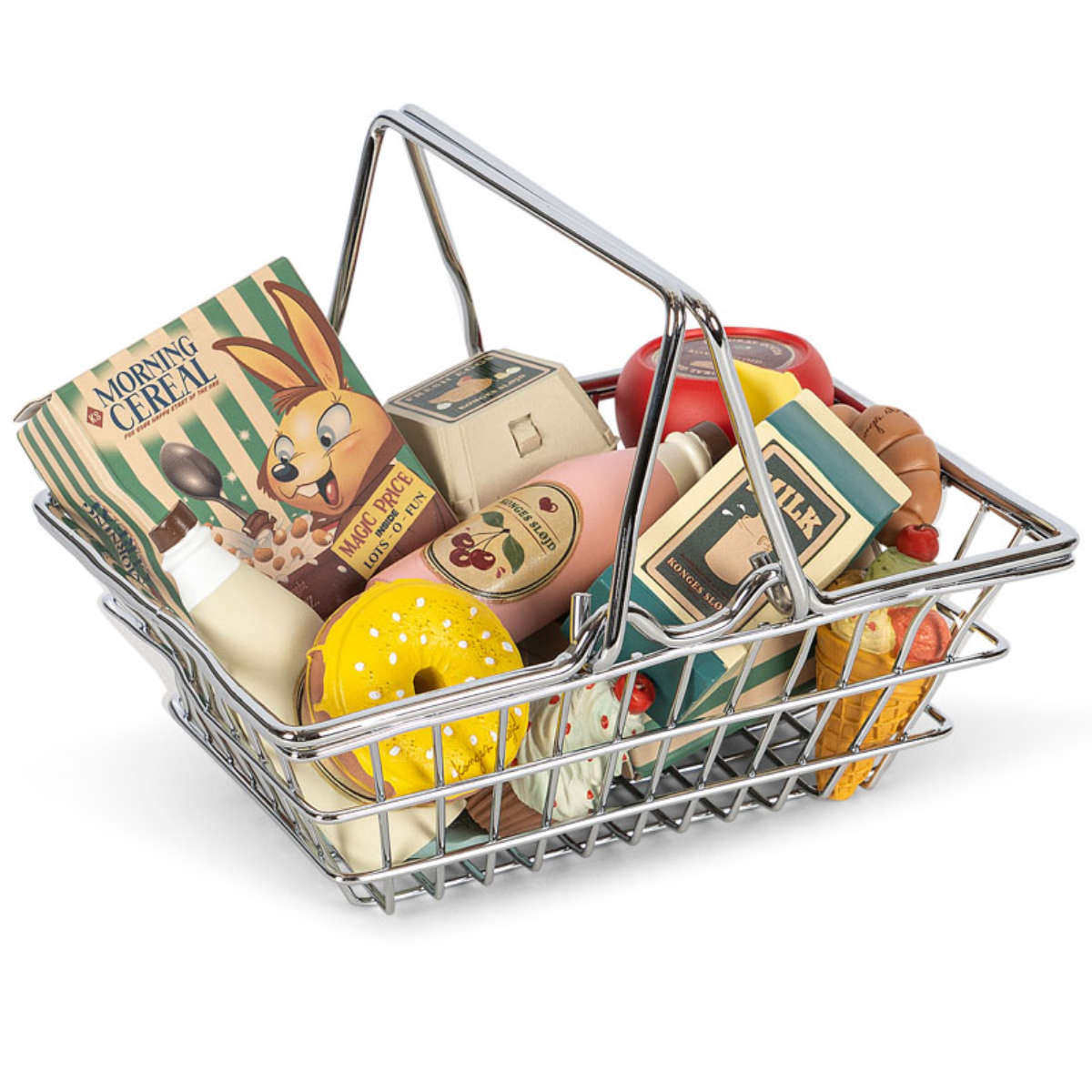De set valt op door een selectie kleurrijke voedingsmiddelen, gemaakt van duurzaam polyresin. Elk onderdeel is zo ontworpen dat het perfect in kleine handjes past. De absolute blikvanger is het stijlvolle metalen mandje, waarin je al je boodschappen kunt verzamelen en stijlvol door de kamer kunt dragen. Zo stimuleer je spelenderwijs je fantasie en leer je verschillende etenswaren kennen.