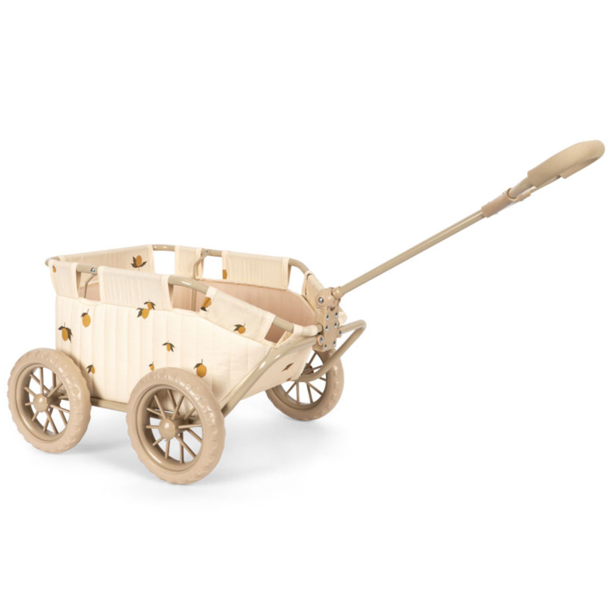 Bij Konges Sløjd gaan kwaliteit en stijl hand in hand. De bolderkar beschikt over een robuust metalen frame van ijzer, wat zorgt voor stabiliteit tijdens elke rit. Om de poppen en knuffels comfortabel te laten zitten, is de kar gevoerd met zacht katoen. De soepel lopende wielen en de handgreep, die ergonomisch perfect is afgestemd op kleine kinderhandjes, maken het duwen kinderspel.