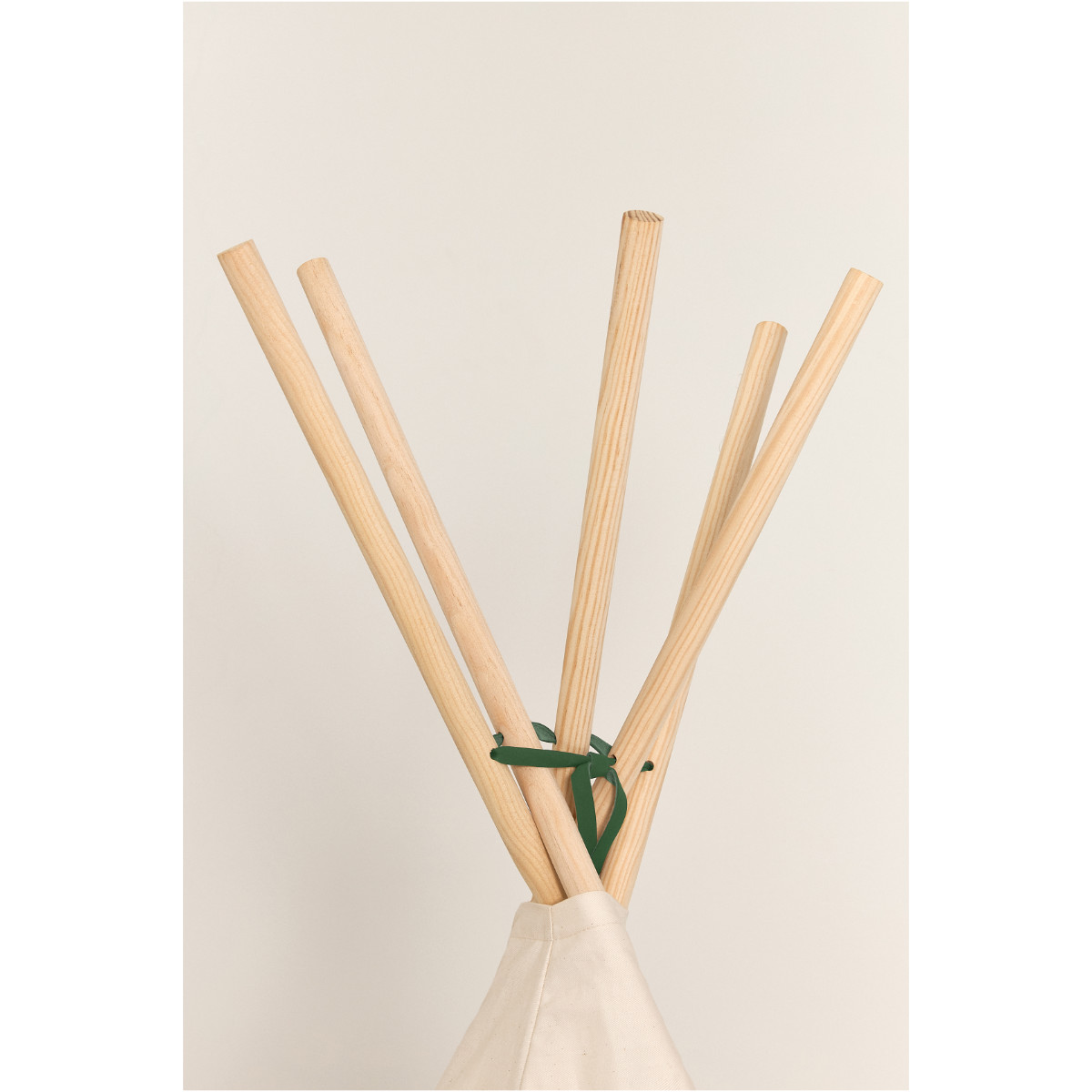 Dankzij de vijf stevige grenenhouten stokken staat de tipi stabiel en veilig. De opbouw is eenvoudig: schuif de stokken in de stoffen tunnels en bind ze bovenaan samen met het koord.